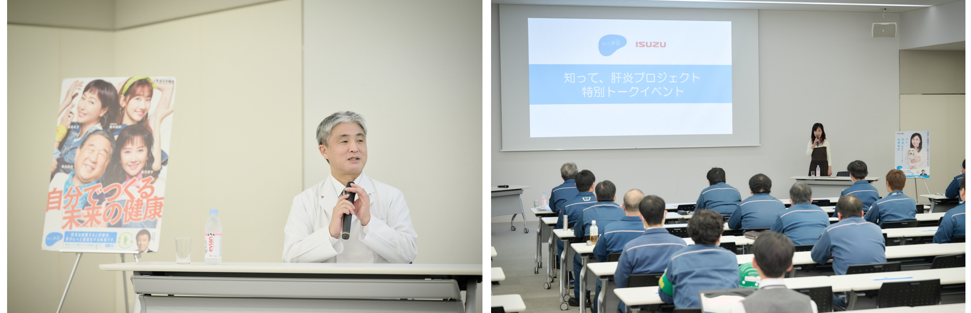 いすゞ自動車の岸下氏は、「ウイルス性肝炎は、自覚症状が無い状態でも肝炎ウイルス検査をすることが大切だということを聞き、健康施策として様々な取組を進めているところではありますが、これを機会に肝炎についても従業員に周知し、健康施策の取組をより一層進めていきたいと思います。」と話しました。