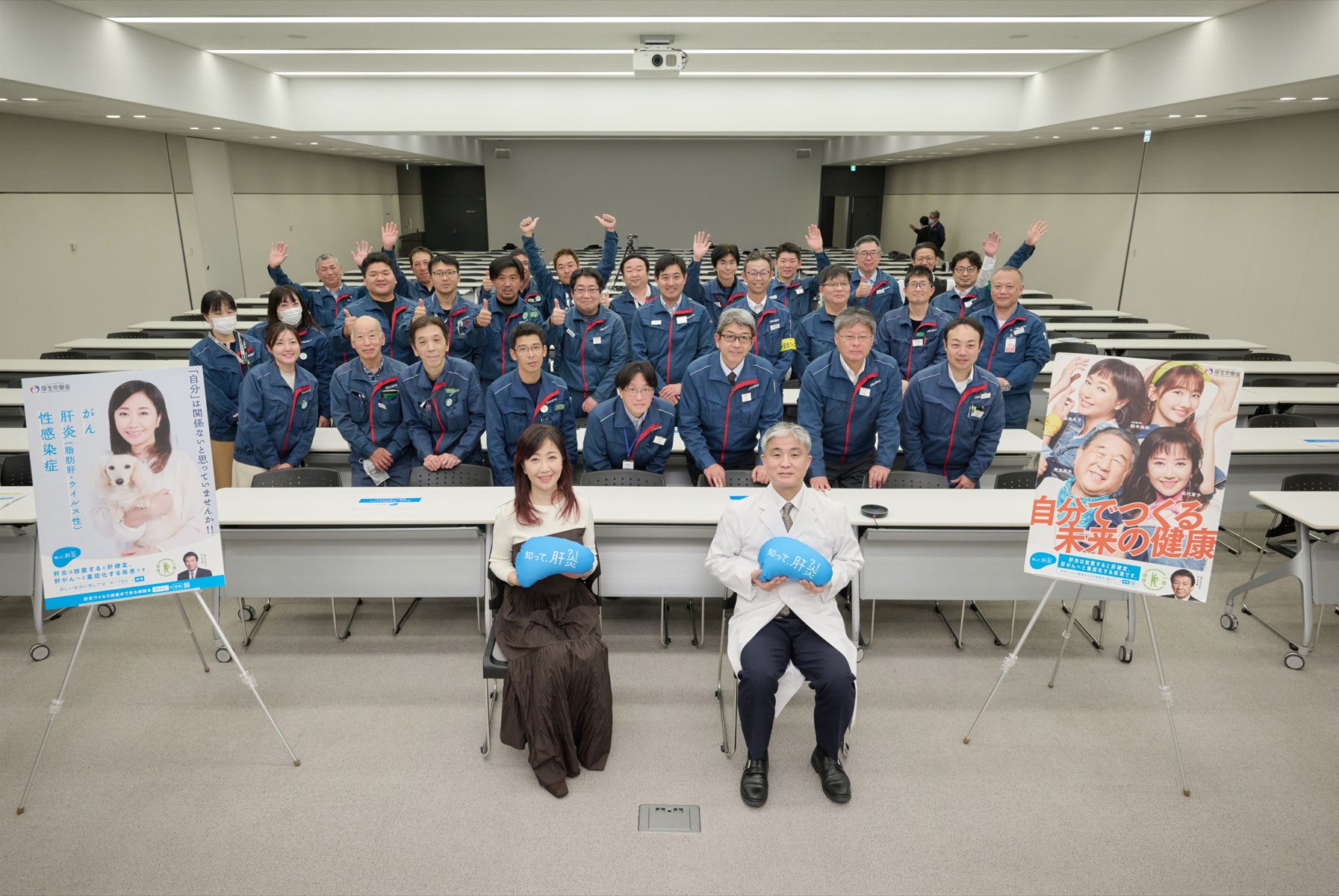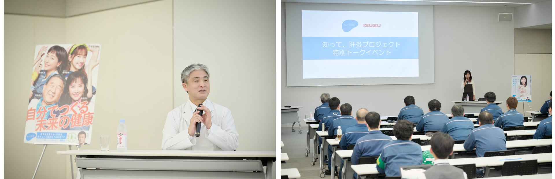 同席した米田先生は、ウイルス性肝炎について「肝炎ウイルスは肝臓の中で肝障害を起こすウイルスで、B型肝炎やC型肝炎は感染した後に適切な治療をしないと体の中に残ってしまいます。慢性的に肝臓にダメージを与えますが、その症状は現れにくいことが特徴です。」と話し、続けて伍代氏は、「自覚症状が出にくいことから、肝臓は“沈黙の臓器”と言われているんです。症状が現れた頃には手遅れになってしまいかねないので、いすゞ自動車の皆さんにも是非、肝炎ウイルス検査を一度受けていただきたいです。」と話しました。