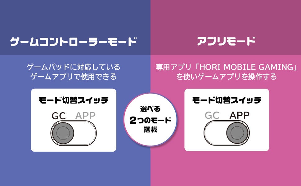 「ゲームコントローラーモード」と「アプリモード」の2つの方式を搭載。コントローラーが非対応のゲームでも操作が可能です。