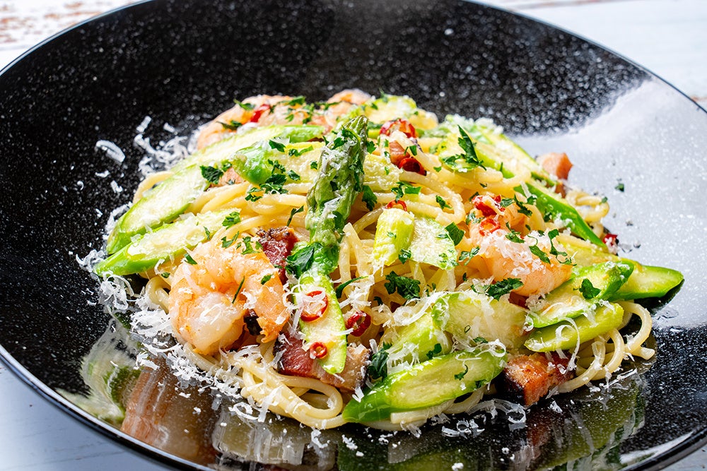 北海道産アスパラを贅沢に使い、香り高い農家のベーコンとぷりぷり海老で楽しむペペロンチーノ。