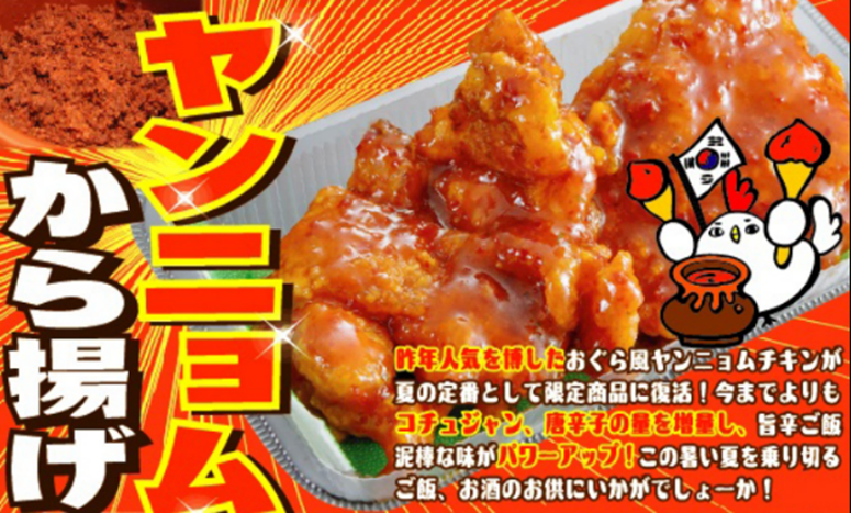 夏の定番!おぐら風ヤンニョムチキン(から揚げ)が復活!今までよりもコチュジャン、唐辛子の量を倍増し、旨辛ご飯泥棒な味がパワーアップしました。