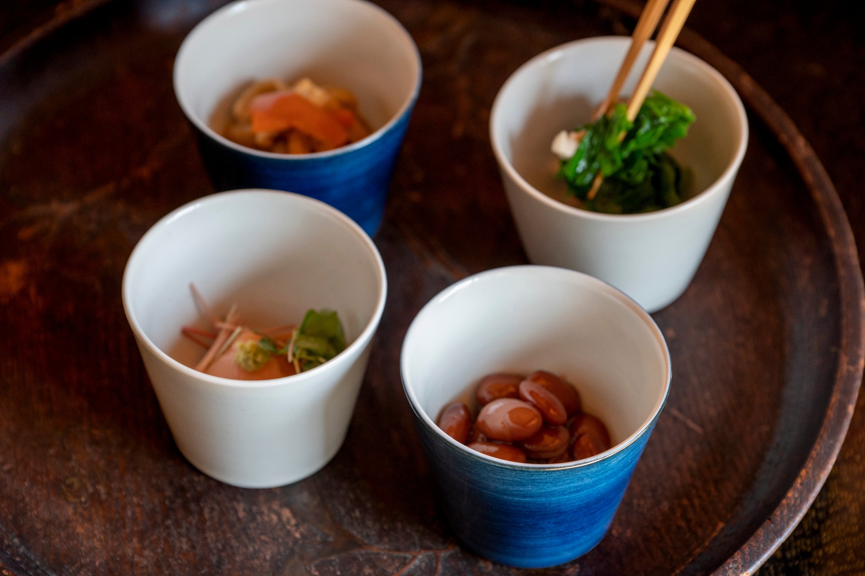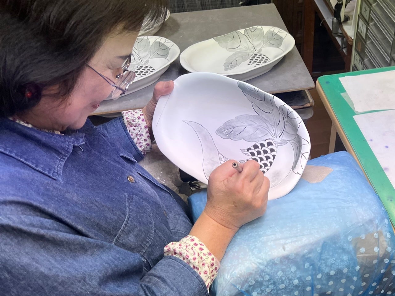 今回の蕎麦猪口を共に手掛けたのは、350年以上の歴史を持つ佐賀・伊万里の瀬貞製陶所「寛右ェ衛門窯」。染付の技術で知られ、筆に含ませる絵の具と水の量を繊細に調節し、色の濃淡を表現しています。
