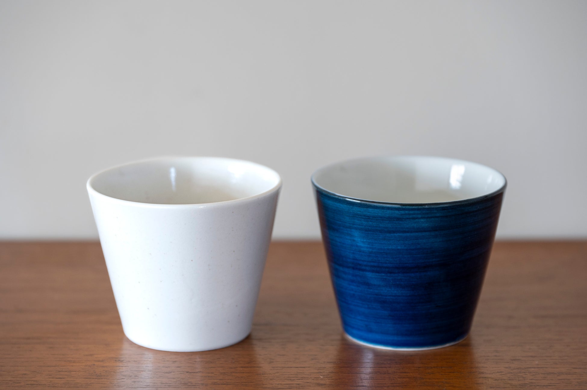 柔らかな白色の「白磁」と、透明感のある藍色の「呉須(ごす)」の2色。「白磁」は陶石に含まれる鉄分の黒点をいかして味わい深い風合いに。「呉須」は素焼きの器に藍色の顔料を刷毛塗りし、刷毛目による藍色の重なりを表現しました。