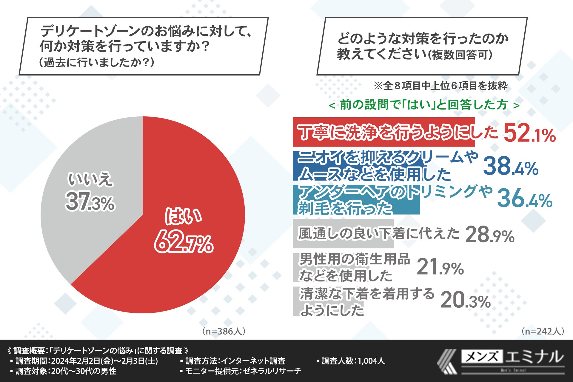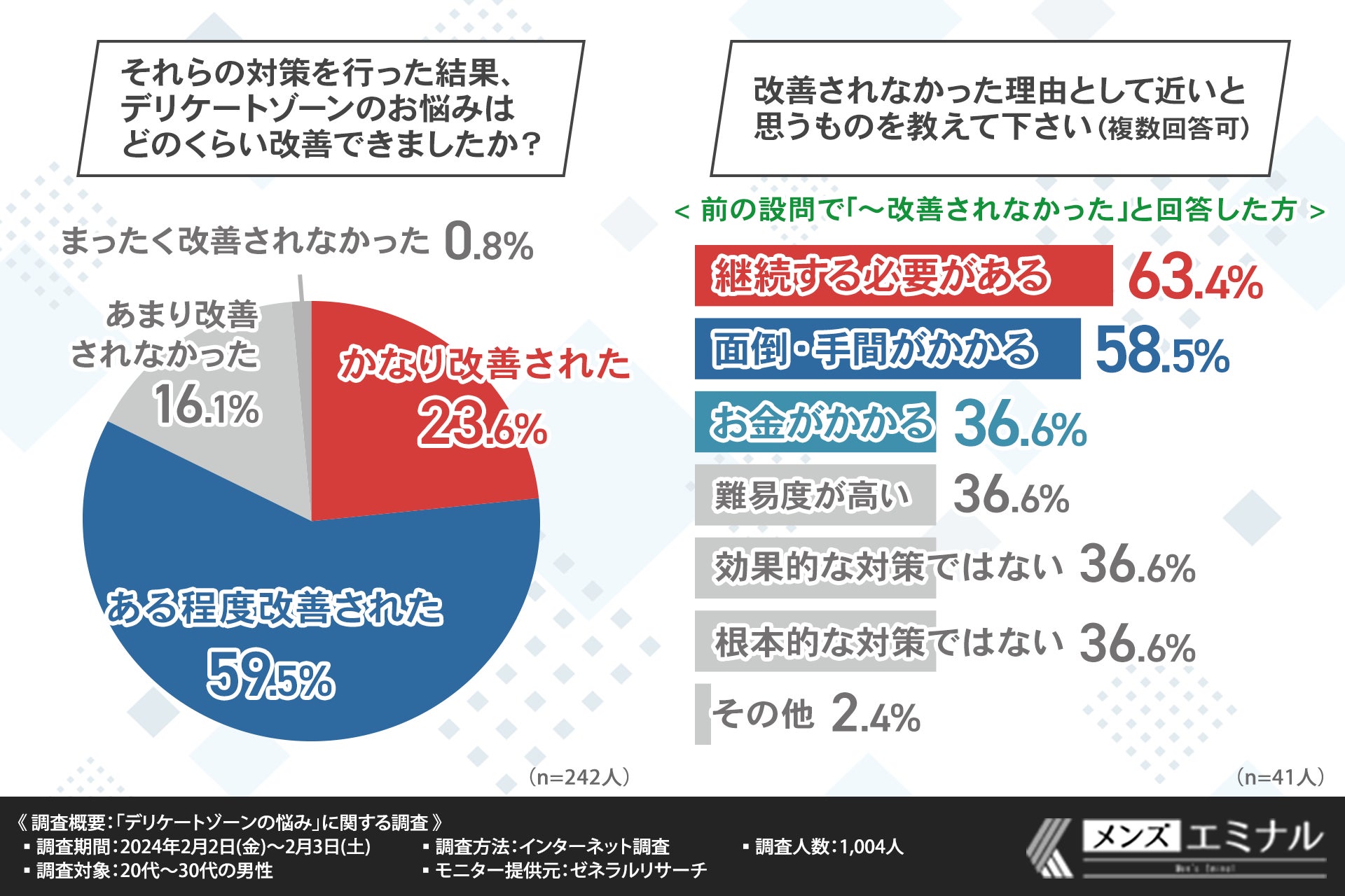 メンズデリケートゾーンの悩みで対策を行っている6割のうち、2割近くが改善しなかったと回答、その原因とは?