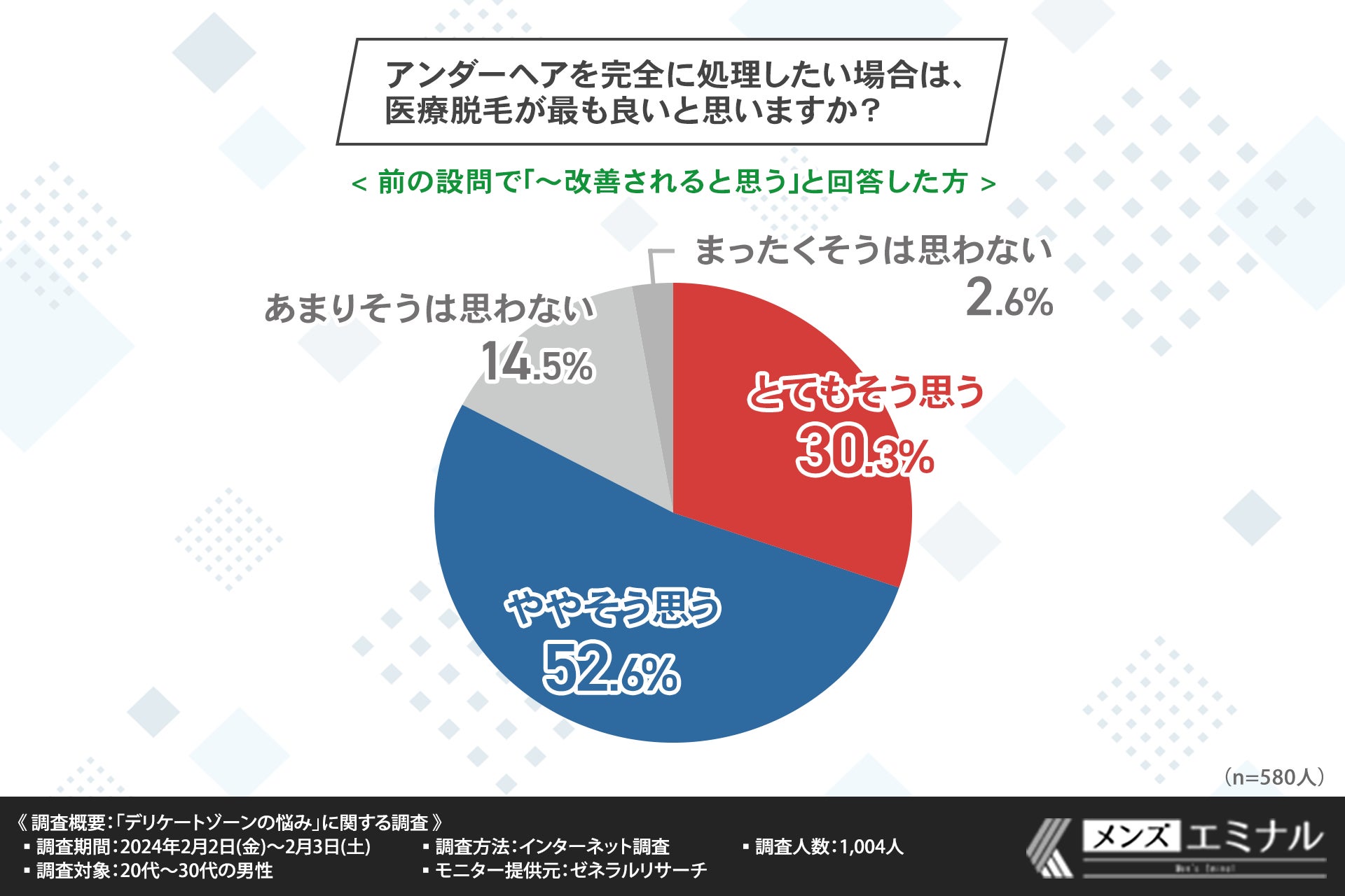最後に、前の質問で改善されると思うと回答した方に、アンダーヘアを完全に処理したい場合は、医療脱毛が最も良いと思うか聞いてみました。