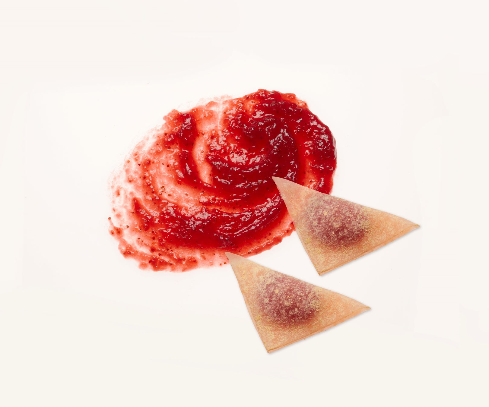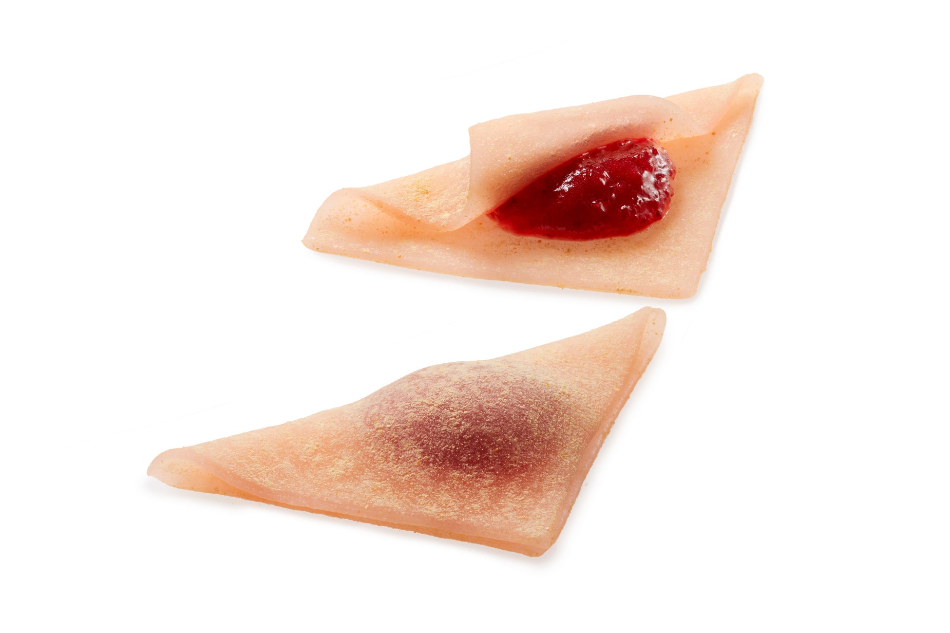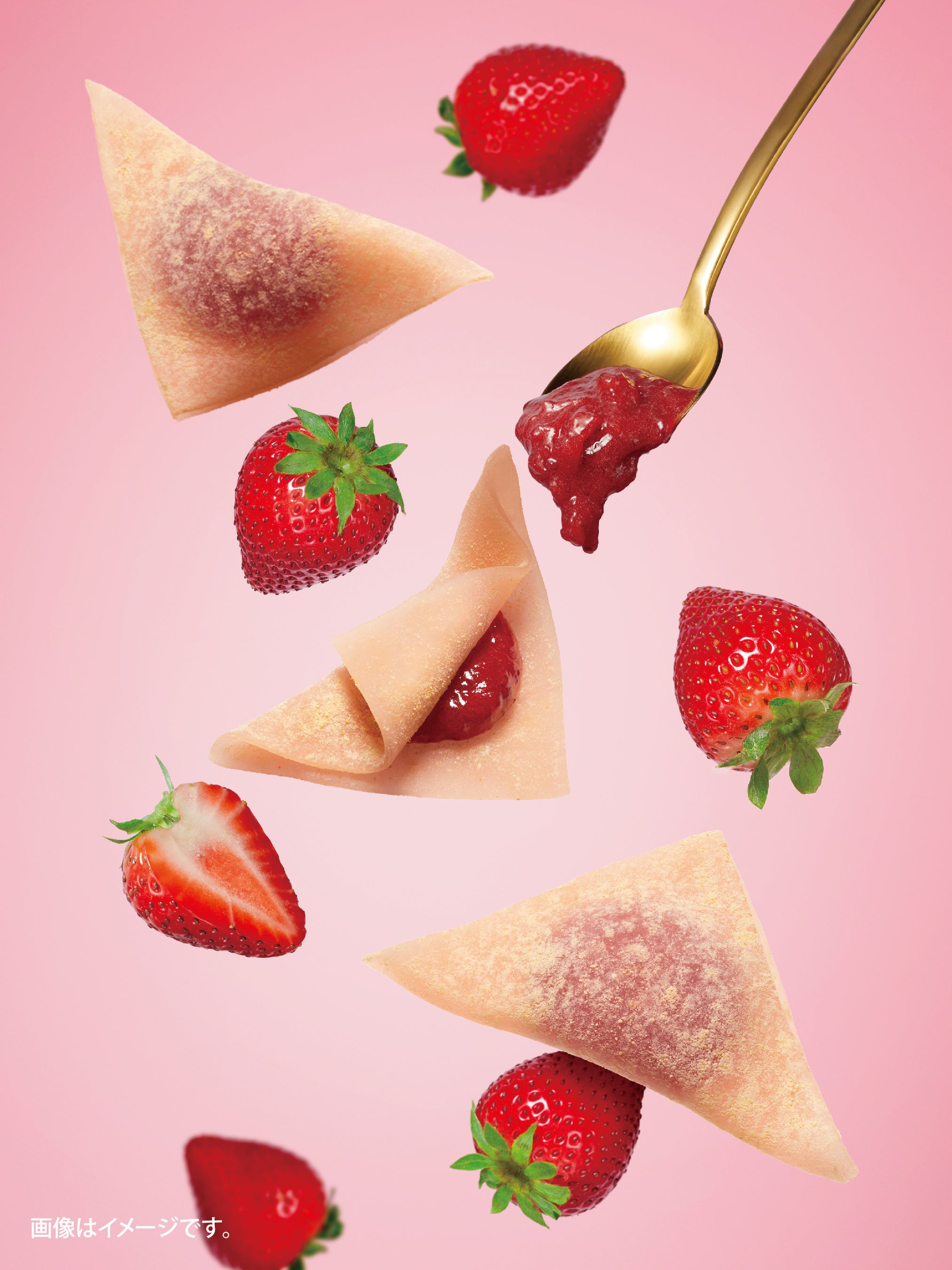 “苺らしさ”とともにこだわったのが“京都らしさ”の表現です。美十の若狭工場にて一から作り込んだ濃密な苺のコンフィチュールを、京都土産として人気の「つぶあん入り生八つ橋」と同じ三角形に包みました。