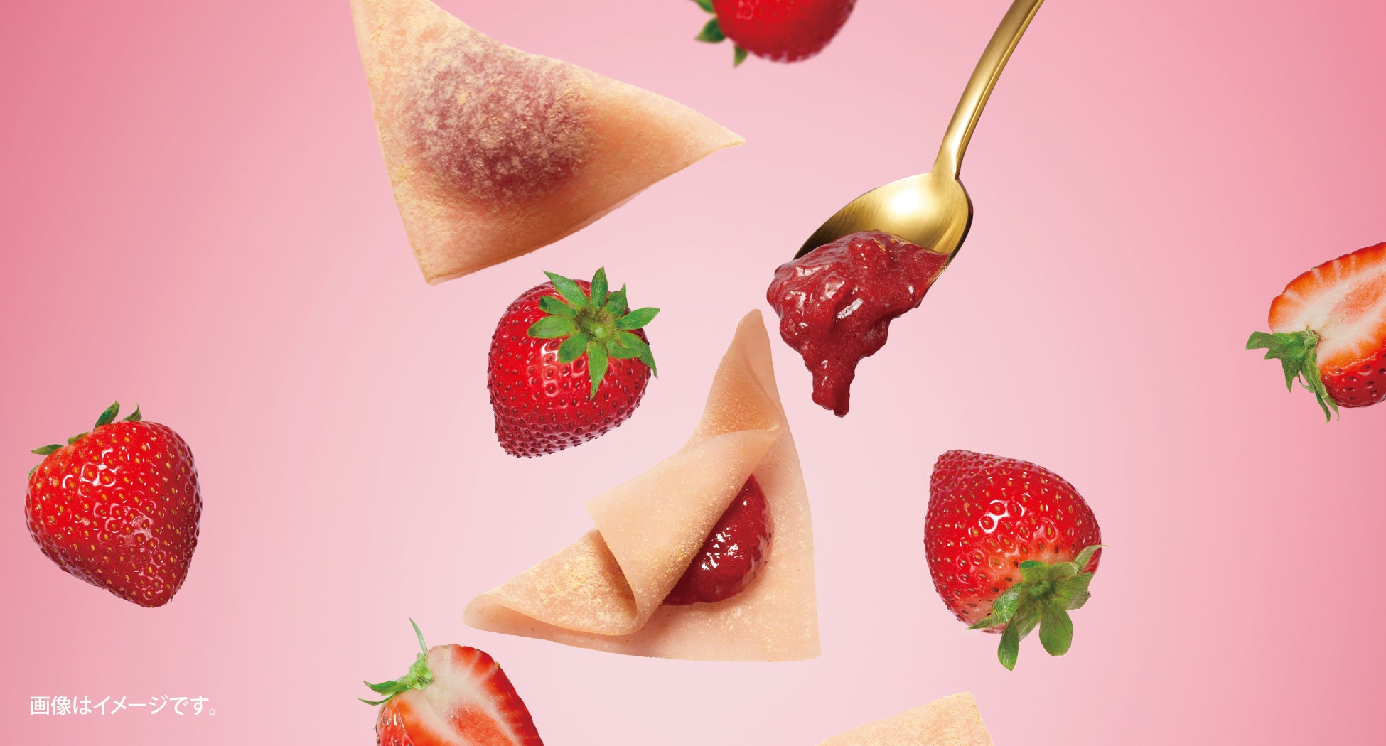 水を一切使わず、果物の水分でとろりと仕上げた濃密なコンフィチュールを、わらび餅のようなぷるぷる食感の生地で包み込みました。美味しさの主役となるコンフィチュールは、苺が持つみずみずしさや酸味、フレッシュ感を引き出すため、何度も試作を重ねました。苺の鮮やかな紅色と濃密で甘酸っぱい味わいを楽しめます。