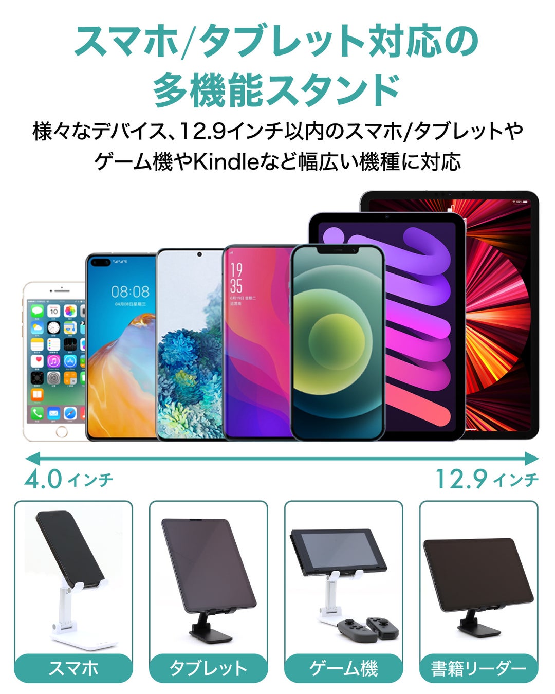 スマートフォンはもちろんのこと、12.9インチ以内のタブレットやゲーム機、Kindleなどの様々な機種に対応しています。