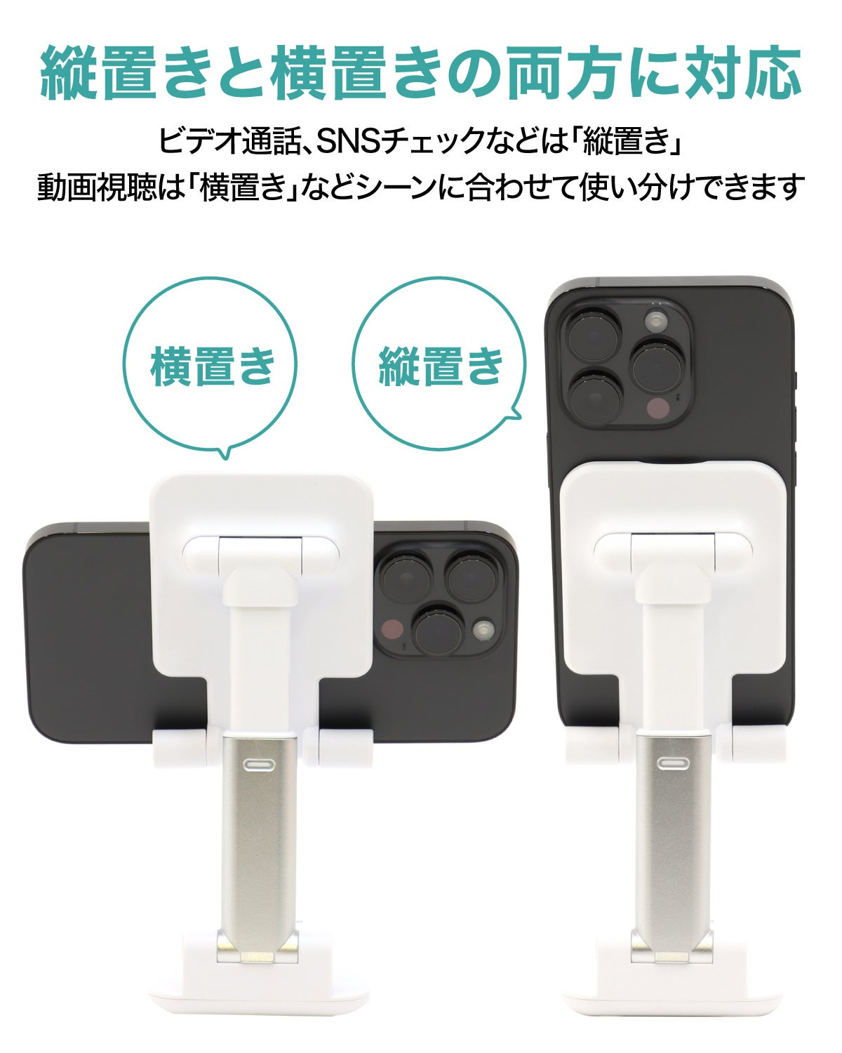 ~ シンプルなデザインで、iPhoneやiPadなど幅広い機種に対応し、横置きも可能な多機能タイプ~