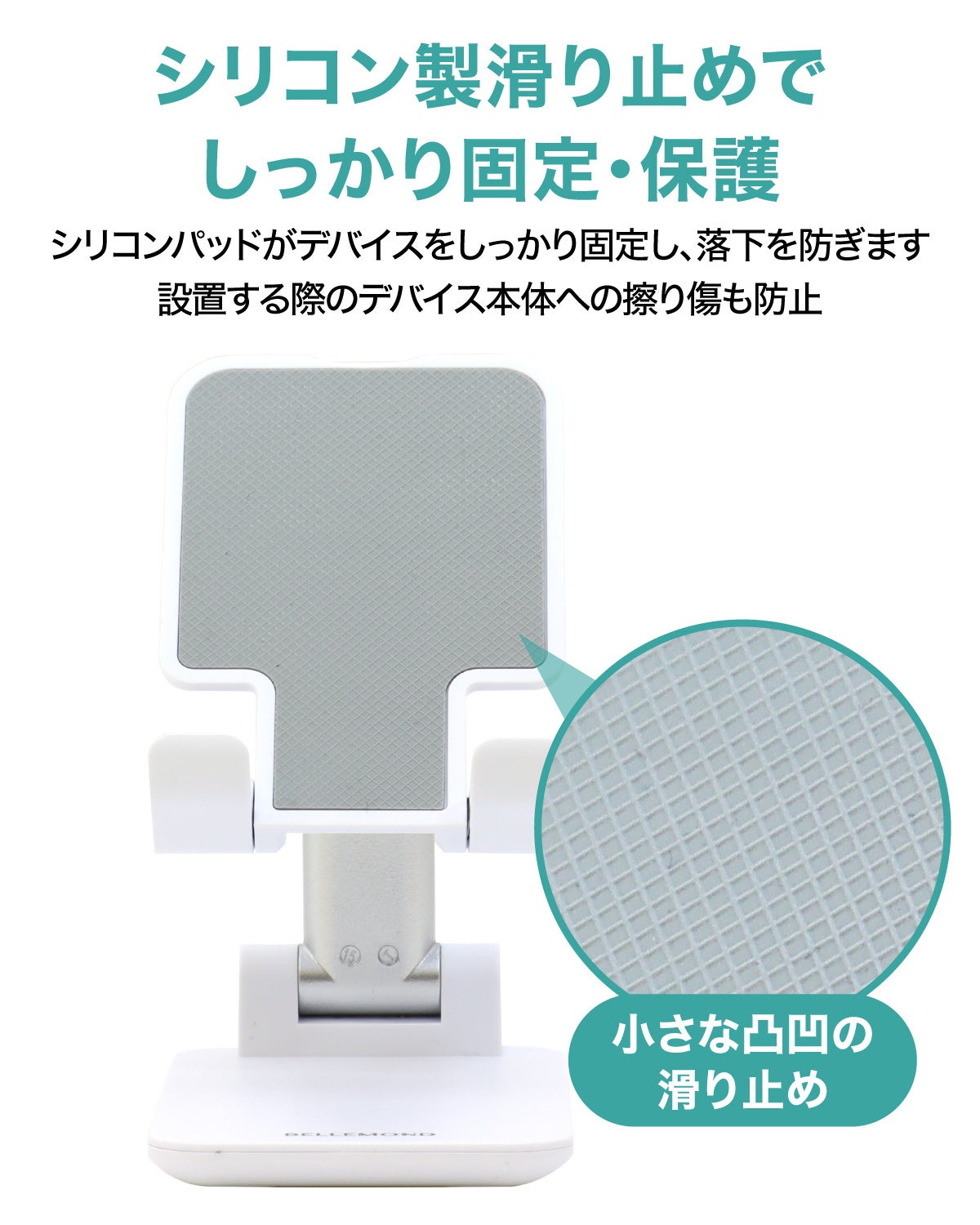 スマートフォンやタブレットなどと接触する底面および土台部分には、シリコン素材のパッドを敷いています。設置デバイスをしっかり固定し、落下を防ぎます。また擦り傷も防止できます。