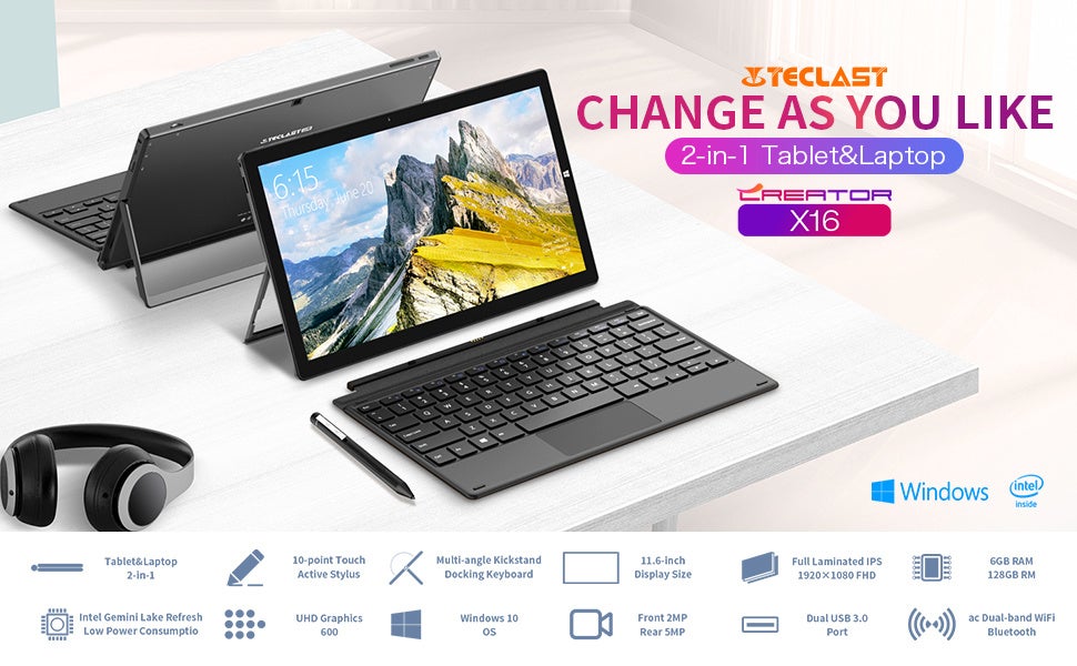TECLAST 2-in-1タブレットPC【X16】は二つのモードをに自由に変換するできます。①ノートパソコンモード:磁気キーボードとスタンドを使用して、X16をノートパソコンに変えます。②タブレットモード:キーボードを取り外し、スタンドを閉じて、強力なタブレットでWebを簡単に閲覧できます。