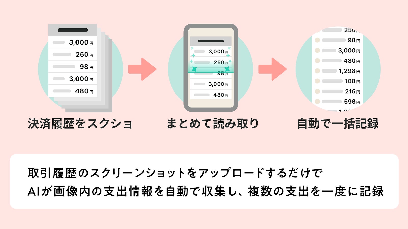 本機能は、他アプリやスマートフォン版ウェブサイトの取引履歴一覧のスクリーンショットをアップロードするだけで、複数の支出を一括で自動記録できるものです。これまで連携が難しかったQRコード決済などの支払い手段にも対応し、支出記録にかかる時間は従来の家計簿への手書きと比べて約85%削減を実現しました。