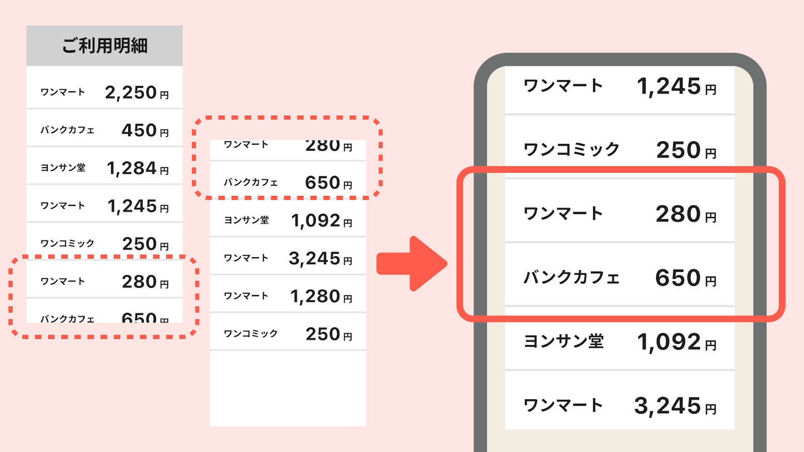 また、本機能では、スマートフォン画面をスクロールしながら連続撮影するときにありがちな、1枚目の写真の最後と、2枚目の写真の最初が重複する問題もAIが自動で判別します。同じ明細を重複登録することがないので、つなぎ目を気にすることなくスクリーンショットを撮ることができます。