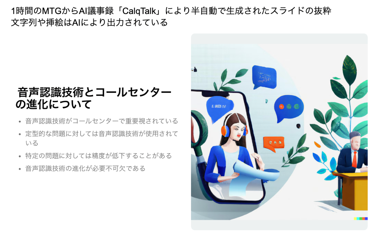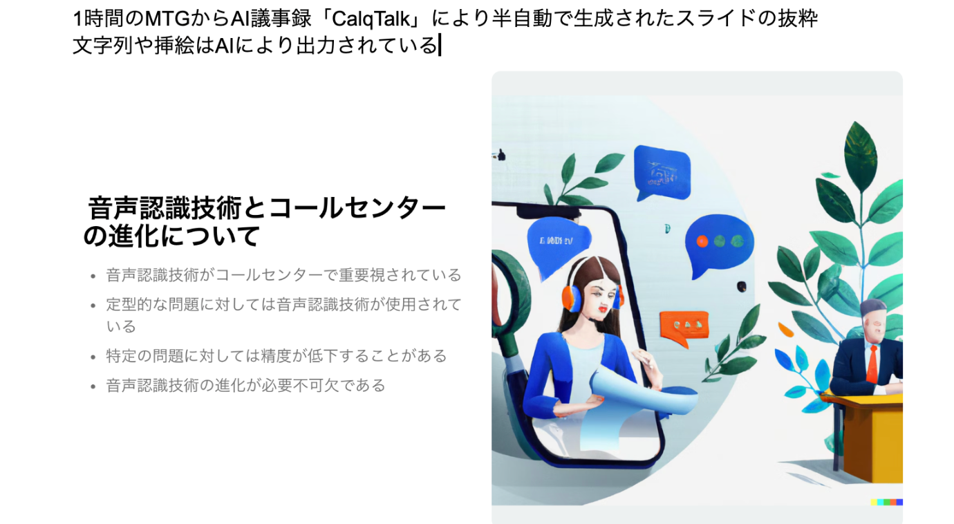 *以下は1時間のMTGの内容をChatGPT、Whisper、DALL·Eを利用し出力したスライドの一部