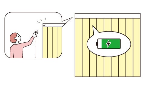 リモコンなどで簡単・快適に操作できる電動製品ホームタコス ラルクシールド /ラインドレープにバッテリー仕様を追加しました。窓の近くにコンセントが無い分譲住宅やマンション、リフォームや窓まわりの掛け替えにおすすめです。また、停電になっても、バッテリーを内蔵しているため安心してお使いいただけます。1回の満充電(約3時間)で約3ヶ月※の使用が可能です。