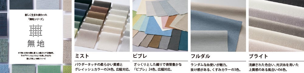 新しい 「無地シリーズ」は、配色、質感、機能にこだわり、リニューアルしました。インテリアに馴染む質感やカラーを重視するとともに、安心・安全で日々の暮らしを豊かにする機能性をさらに充実させたラインナップです。無地カテゴリーではありながらも、質感や配色もデザインの一部であると位置づけ、今までにはないパウダータッチな質感の「ミスト」やランダムな糸使いの「フルダル」など、多彩なラインナップをご用意しました。