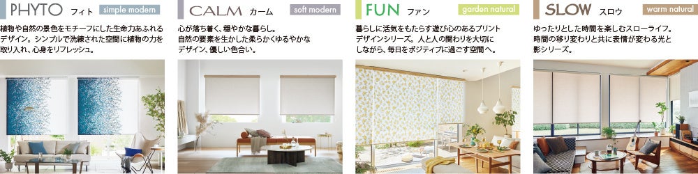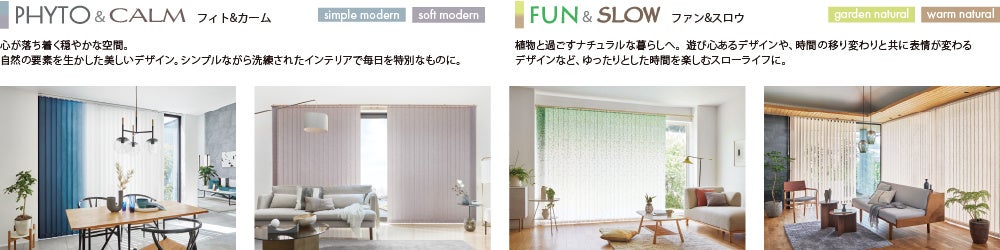 ロールスクリーン「ラルクシールド」は、『ウェルビーイング』をテーマに心の整え方や自分らしい暮らし方を表現した、PHYTO(フィト)・CALM(カーム)・FUN(ファン)・SLOW(スロウ)の4つのカテゴリーをテーマにリニューアルしました。タテ型ブラインド「ラインドレープ」では、モダンテイストの「PHYTO&CALM」、ナチュラルテイストの「FUN&SLOW」の2つのカテゴリーとすることで、テイスト毎に選びやすいラインナップにしました。