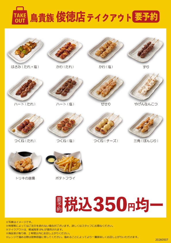 5月7日(木)より、俊徳店にてテイクアウト販売を開始いたします。店内でのご飲食後のお土産や、鳥貴族記念館にご来館いただいた際のお立ち寄りなど、お気軽にご利用ください。