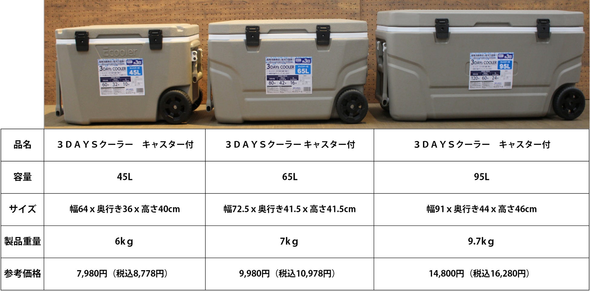 高性能の保冷機能を備えた「3DAYSクーラー」は、3種類のサイズ容量で展開しています。全てのサイズにキャスターが装備されています。45Lは天板面にカップホルダーが、65Lと95Lの天板面には簡易メジャーが付いています。