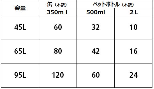 45Lの容量で350ml缶が最大60本、95Lの容量で120本収納することが可能です。