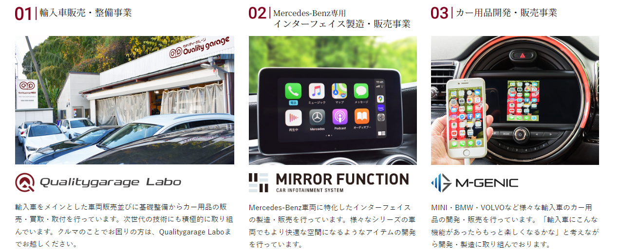 私たちはクオリティーガレージは、輸入車をメインとした車両・製品の販売・取付・買取を行っています。