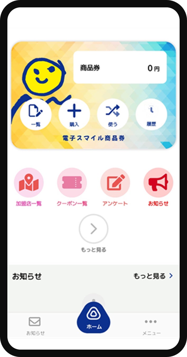 「港区電子スマイル商品券」アプリは、当社が展開するリージョナルスーパーアプリ®(RSA)として開発しており、商品券機能のほか、利用店舗の検索やプッシュ通知による商店会情報のお知らせなど、さまざまなサービスをまとめたスマートフォンアプリです。
