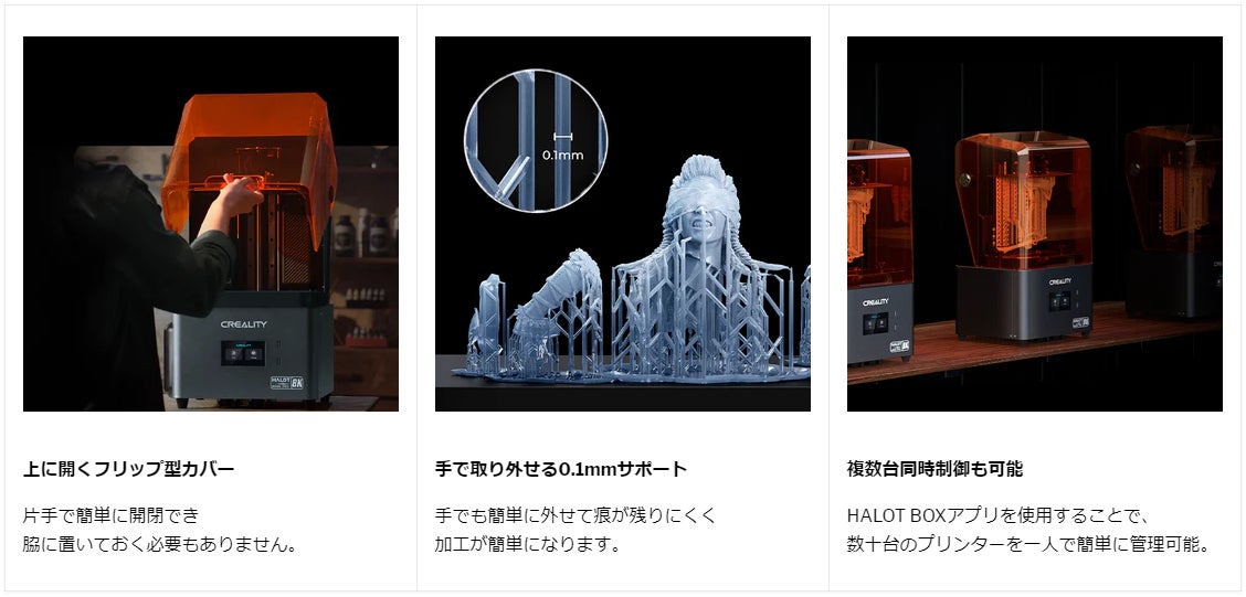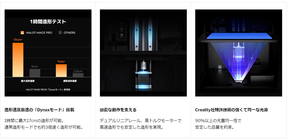 造形速度は170mm/h。 同時発売の廉価版HALOT-MAGE 8Kは最高40mm/hとなり、品質を保ったまま約4倍の高速造形が可能になります。