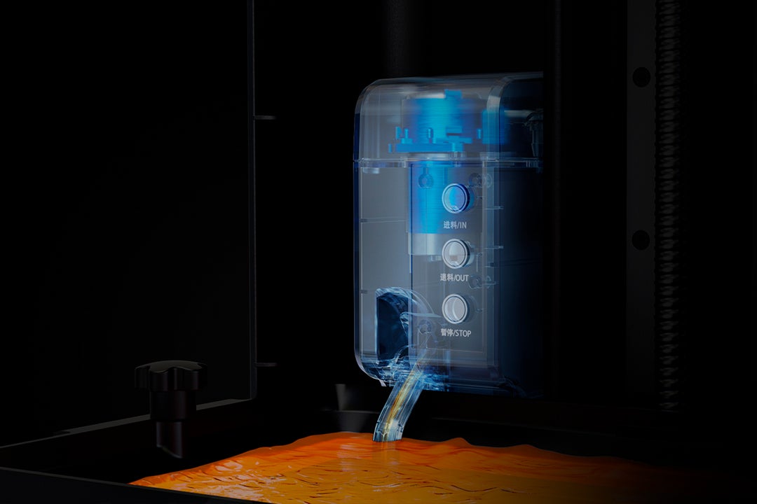 Creality HALOT-MAGE PRO 8Kは、レジンの自動充填・戻し機能を搭載。30分以内に1リットルの樹脂を補充・回収することが可能です。手作業が少なく、飛び散りや汚れも少なくなります。投入口は、どんな容器にも自由に刺せるようになっています。