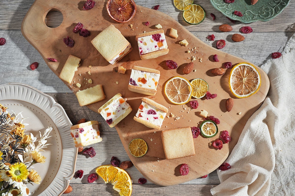 瀬戸内産のレモンのほか、南国の恵みを受けて育ったパパイヤなどのドライフルーツをたっぷりと混ぜ込んだカッサータを、コンパクトで持ちやすいサイズのサブレに挟みました。