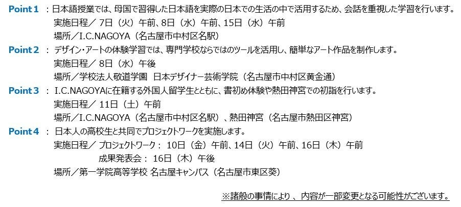 I.C.NAGOYAでは、2024年7月にも同様のコースを実施し、参加者、関係者から大変高い評価をいただきました。この実績を踏まえ、さらに内容を充実させた短期文化体験コースを再び開催する運びとなりました。両国の学生が交流を深め、互いの文化を直接体験することで、グローバルな視点を備え、国際社会で活躍できる人材の育成を目指してまいります。