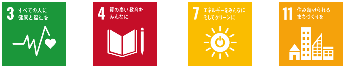 これらはSDGsの目標である「すべての人に健康と福祉を」「質の高い教育をみんなに」「エネルギーをみんなに、そしてクリーンに」「住み続けられるまちづくりを」の4つのコンセプトをもとにしております。