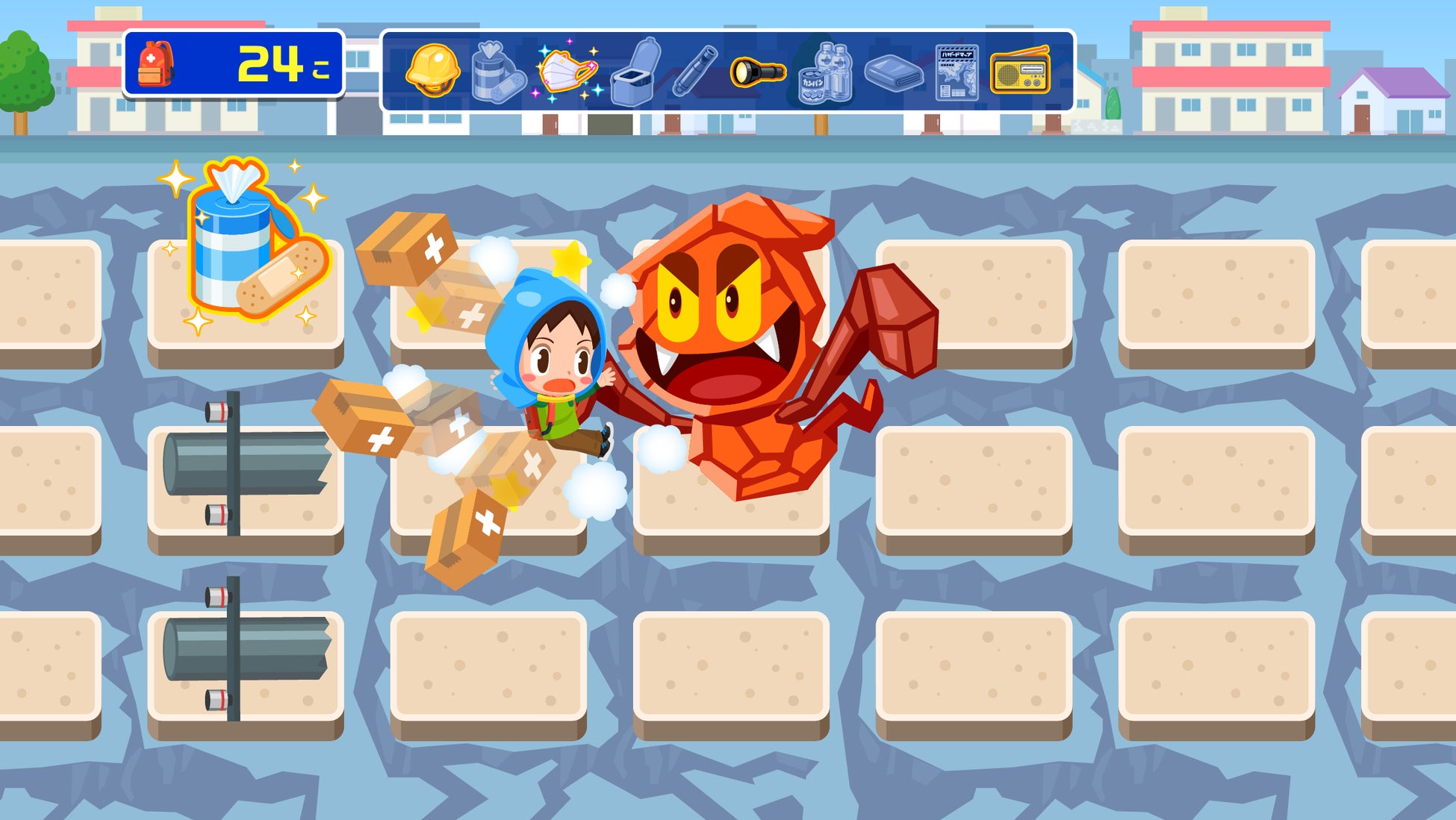 火災をテーマにした従来の「ひなんくんれんチャレンジ」では、「けむりオバケ」が登場しましたが、今回は「じしんオバケ」「すいがいオバケ」が登場し、プレイヤーの邪魔をしてきます。また、特定の防災グッズを集めることができると「フィーバータイム」に突入。防災グッズの数を増やすことができるチャンスタイムが始まります。