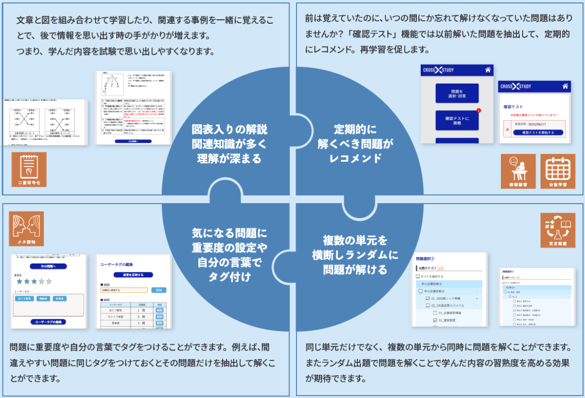 あわせて、自然に認知心理学の学習法を取り入れながら問題を解くためのWeb学習ツール「CROSS STUDY」を開発しました。 クレアールが選び抜いた問題をいつでもどこでも解くことができます。CROSS STUDYを利用して問題を解き進めることで効率的に合格に必要な知識を覚えることができます。また過去に解いた問題に対して定期的に確認テストが配信されることで、再学習が促され強固な記憶定着に繋がります。
