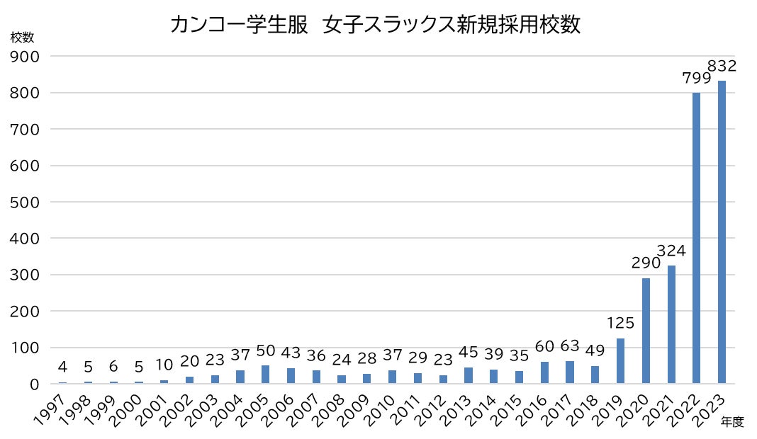 その後、女子スラックス新規採用校は、2020年以降に急激に増加しました。特に2022年は、2021年の倍以上となり、2023年度は800校を超えました。