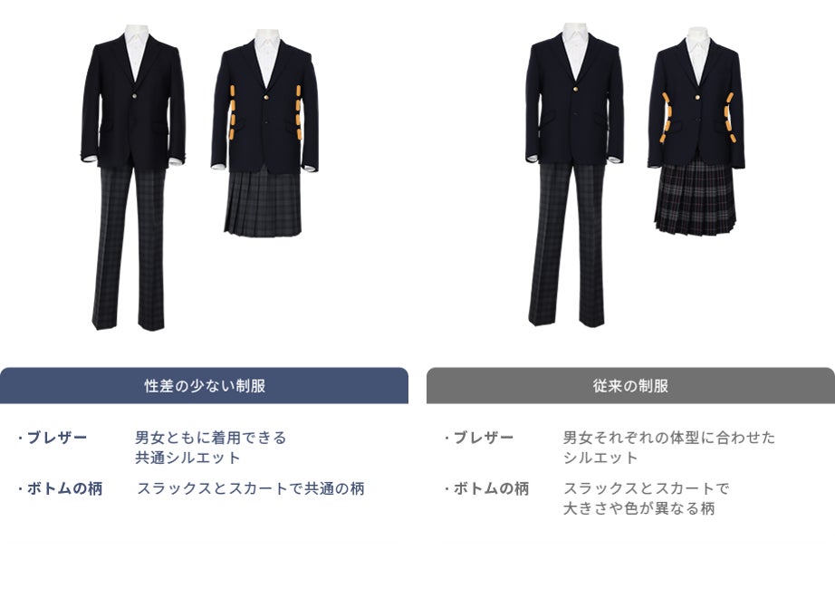 また、ここ3年ほど、制服のモデルチェンジ数も従来の2~3倍に増加しており、ブレザー化が顕著となっています。今後もジェンダーレス制服のみならず、全ての子どもたちが心身ともに快適に過ごせる、スクールユニフォームウエアの企画・開発を続けてまいります。