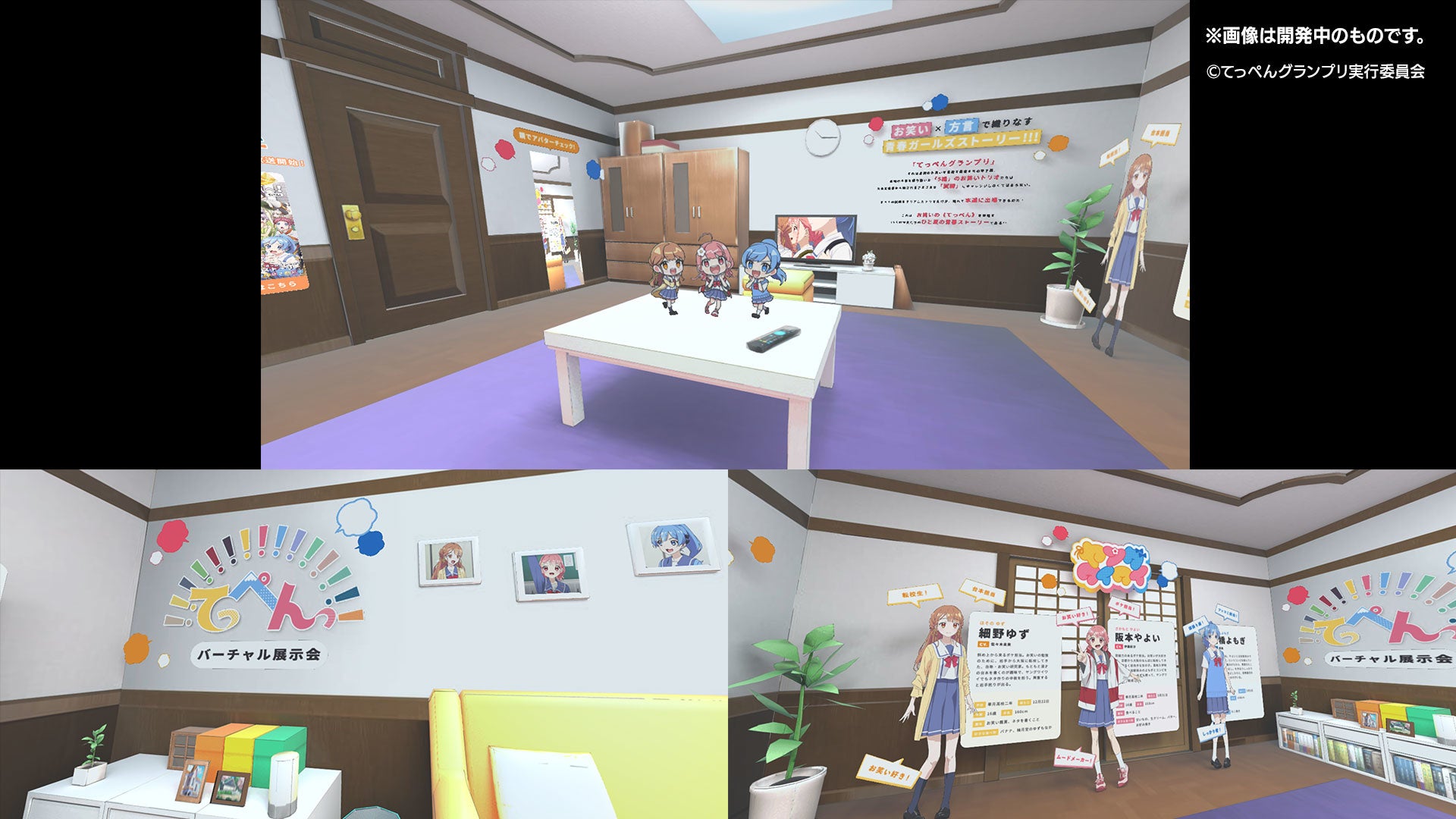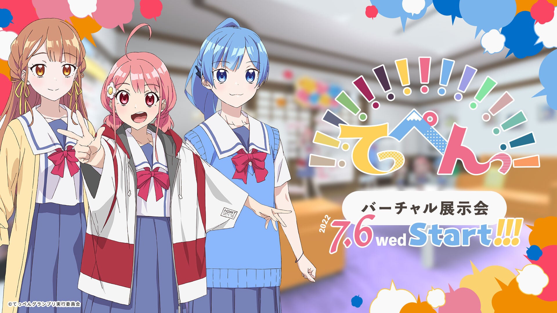 さらに、TVアニメ「てっぺんっ!!!!!!!!!!!!!!!」に登場するトリオ「ヤングワイワイ(CV:伊藤彩沙、愛美、佐々木未来)」のお部屋を再現した『てっぺんっ!!!!!!!!!!!!!!! バーチャル展示会』を7月6日(水)12:00~9月30日(金)12:00の期間限定で無料開催いたします。スマートフォン やパソコンなどの端末からTVアニメ「てっぺんっ!!!!!!!!!!!!!!!」の世界をバーチャルで楽しむことができます。アプリの導入も不要で、Webブラウザから簡単に展示会にご入場いただけます。