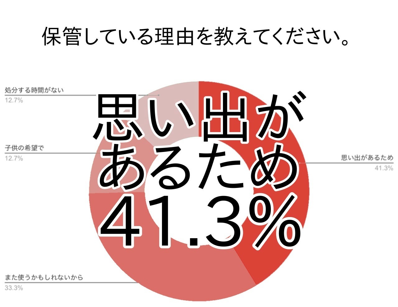 使わなくなった子供のものを保管している理由で最も多かったのは「思い出があるため(関東41.3%・全国41.5%)」でした。