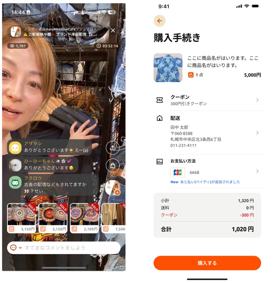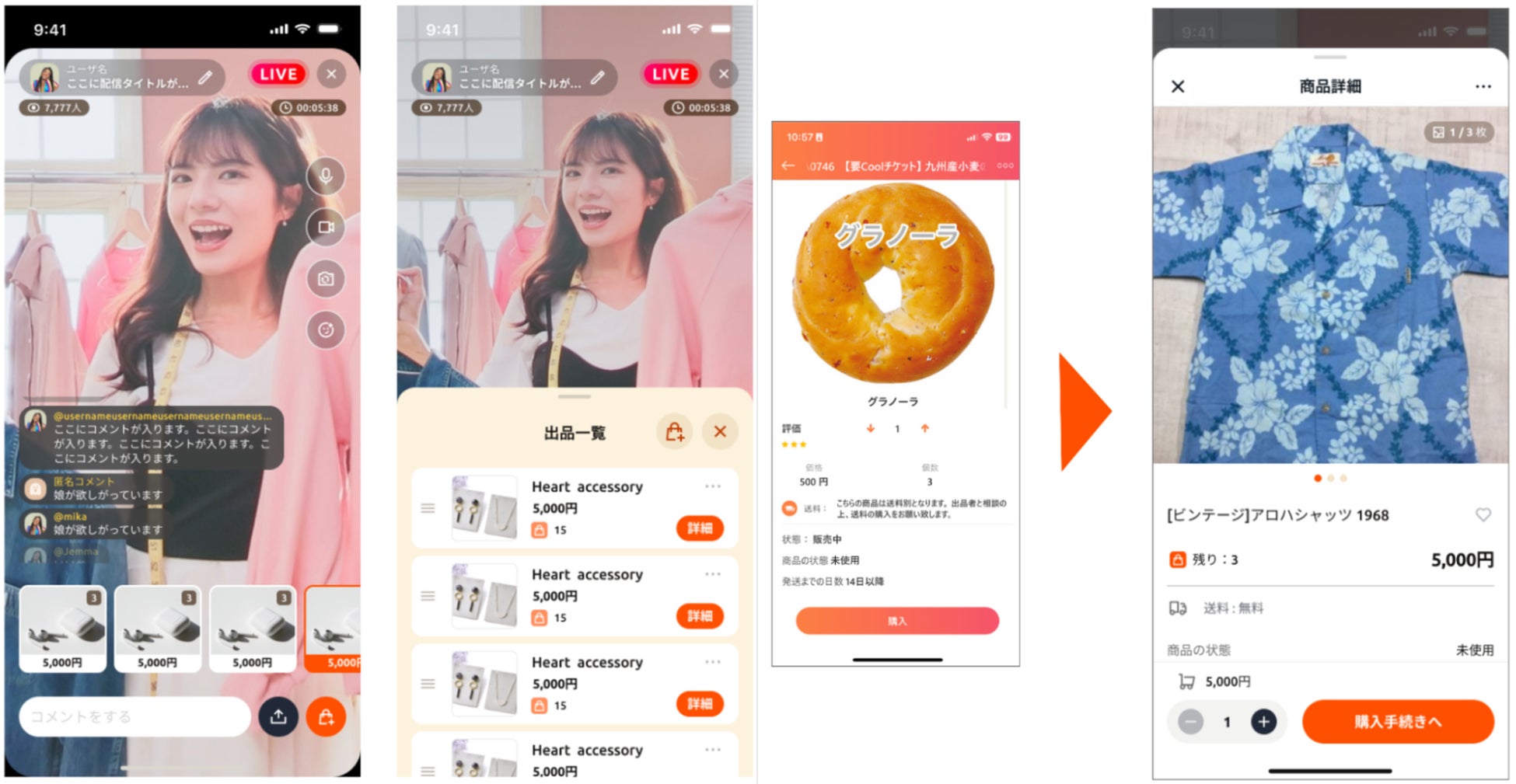 ①ライブを見ながら2タップで商品の購入・決済が可能