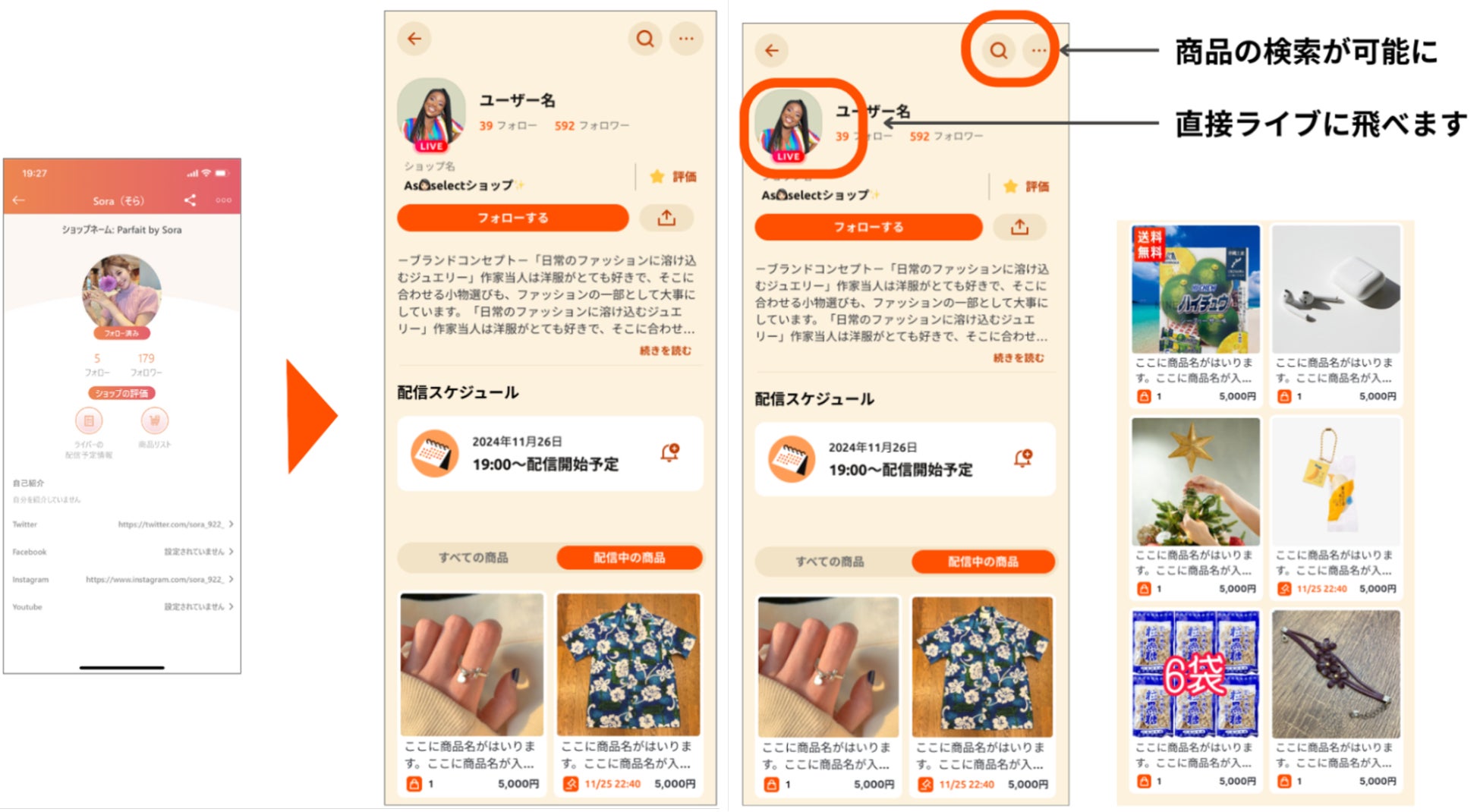 ショップページで配信スケジュールや商品が見つけやすく、さらに商品を一覧で見やすく、商品検索もできるようになりました。