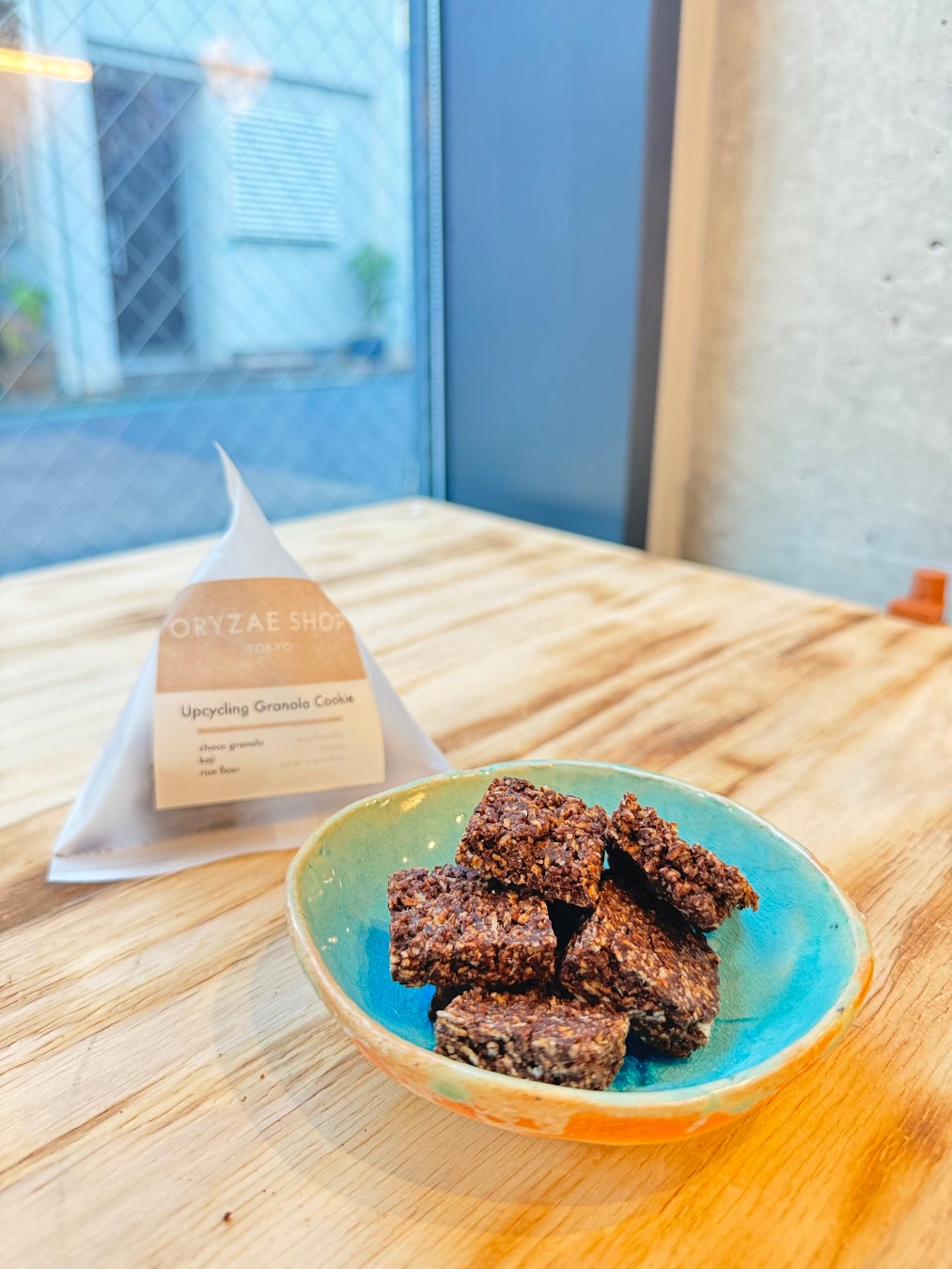 アップサイクルクッキーとは、グラノーラを焼成する過程で出てしまう欠けたグラノーラや粉末状になってしまったグラノーラを廃棄することなく、クッキーとして再成形することで食品ロスを減らしていこうという取り組みで作られたサステナブルなクッキーのことです。