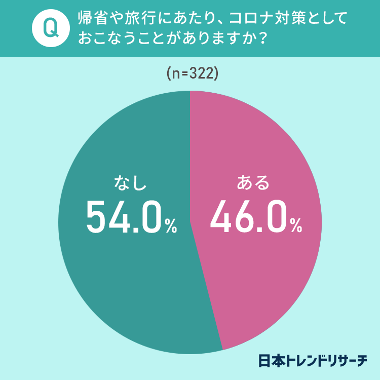 旅行・帰省をするにあたり、「いつもはおこなわないが今年はおこなうコロナ対策」が「ある」と回答した方は46.0%で、半数程度の方が新たなコロナ対策を取り入れているようです。