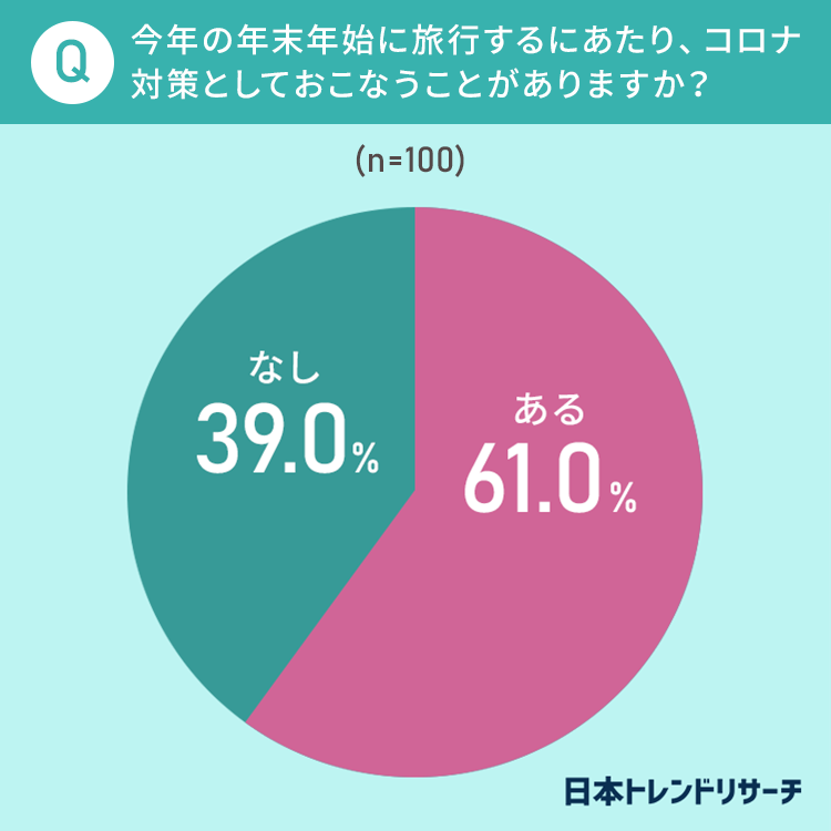 一方、旅行の場合は「ある」と回答した方は61.0%でした。帰省よりも旅行へ行く場合の方が「いつもはおこなわないが今年はおこなうコロナ対策」をする方の割合が多い結果となりました。