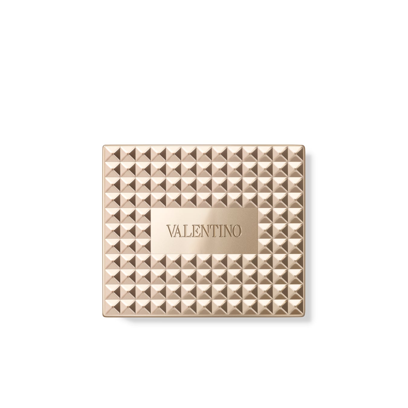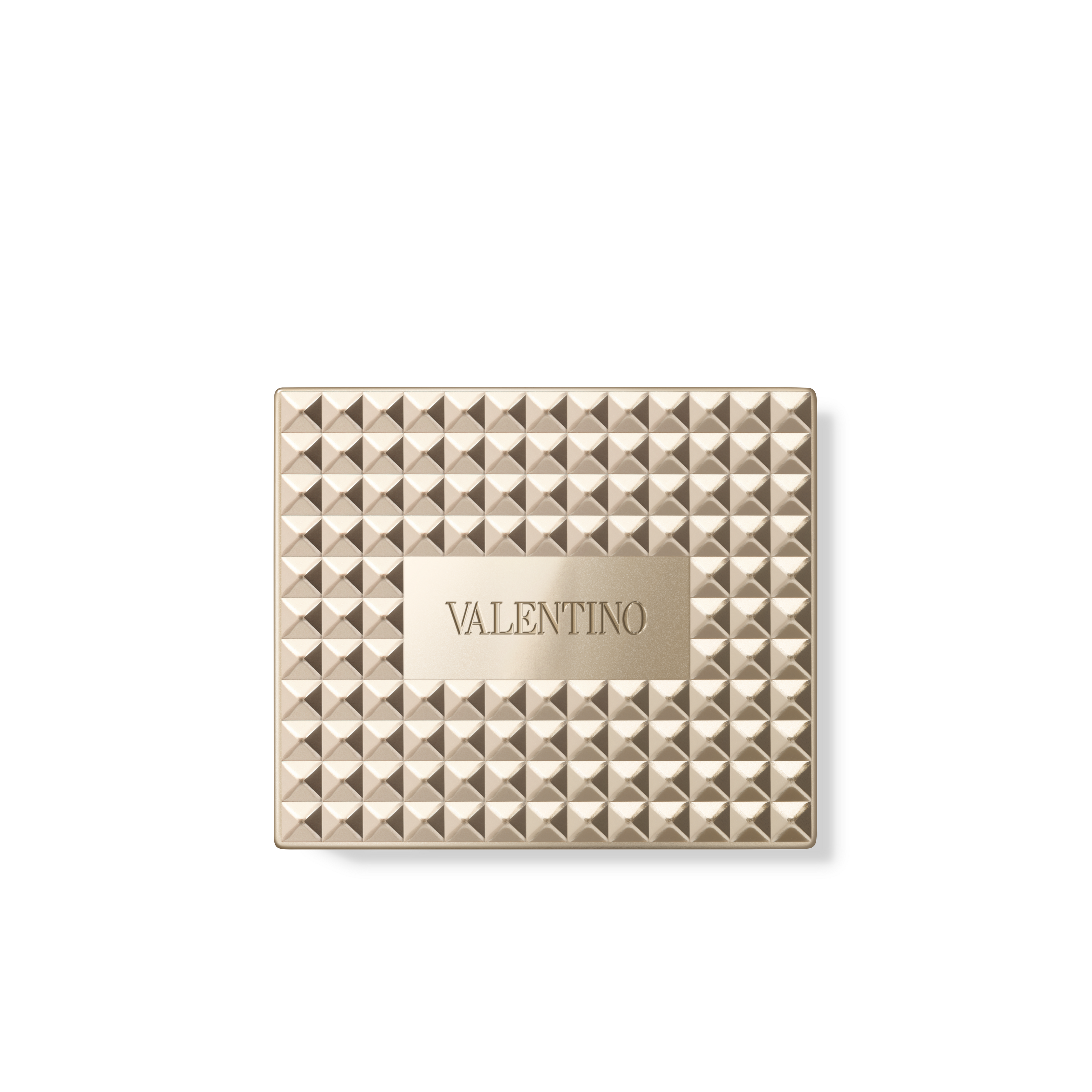 ヴァレンティノのバッグから着想を得た、122個のゴールドスタッズを全面にあしらった印象的なコンパクトは、単なるメイクアイテムではなく、コレクタブルなステートメントピースのようなデザインです。