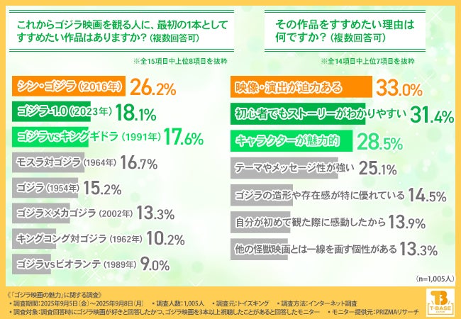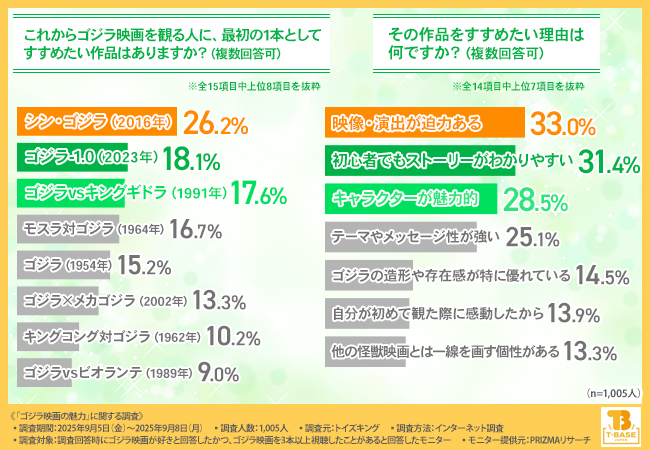 『T-BASE JAPAN』を運営するトイズキング(本社所在地:名古屋市中村区、代表者:山本 祐介)は、ゴジラ映画が好きでゴジラ映画を3本以上視聴したことがある方を対象に、「ゴジラ映画の魅力」に関する調査を行いました。