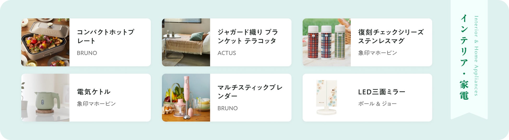 BRUNOのホットプレートや、象印マホービンの電気ケトルなどのインテリア・家電など、魅力的な商品を5,000以上取り揃えております。