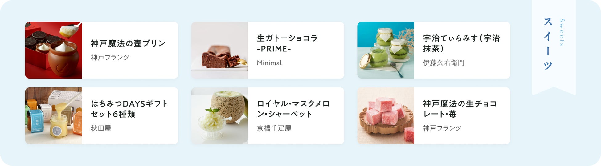 千疋屋のフルーツや、神戸フランツの魔法の壺プリンなどのグルメやスイーツ。