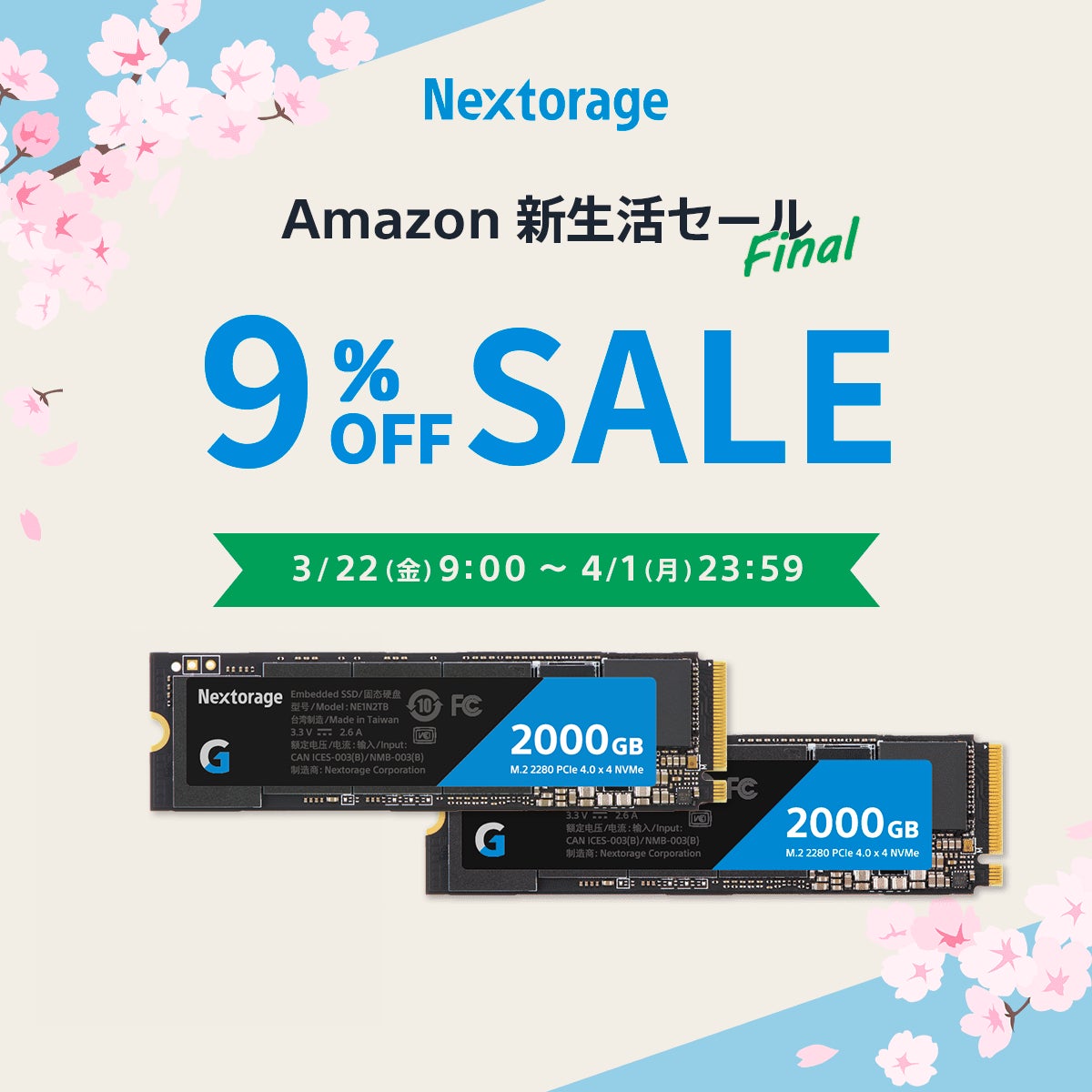 Nextorage(ネクストレージ株式会社、代表取締役:本多 克行、神奈川県川崎市)は3月22日から始まるAmazon新生活セール FINALの先行セール、およびAmazon新生活セール FINALに参加することをお知らせいたします。