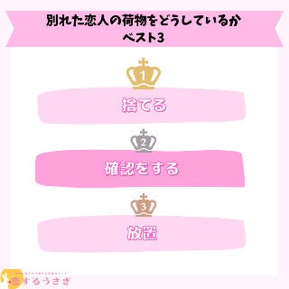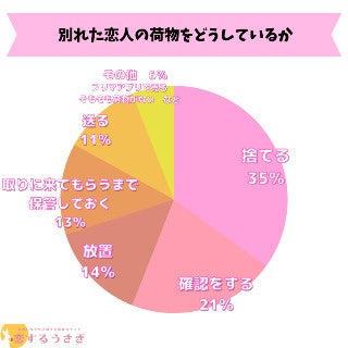 恋するうさぎ編集部が行った「別れた恋人の荷物をどうしているか」のアンケートによると1位捨てるが35%、 2位は確認をするが21%、3位は放置が14%という結果になりました。