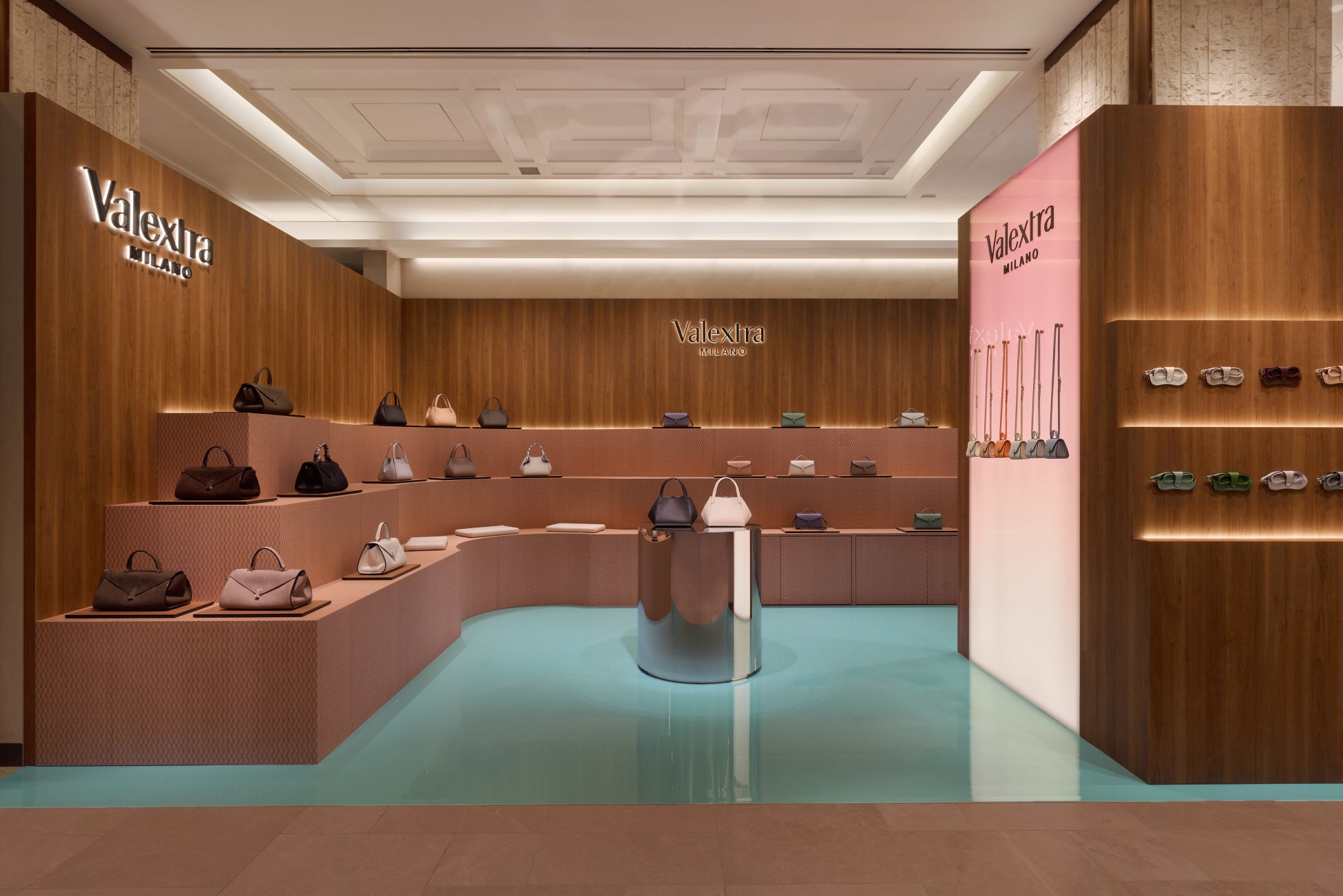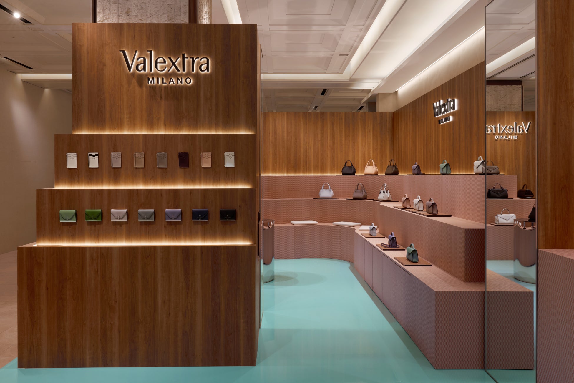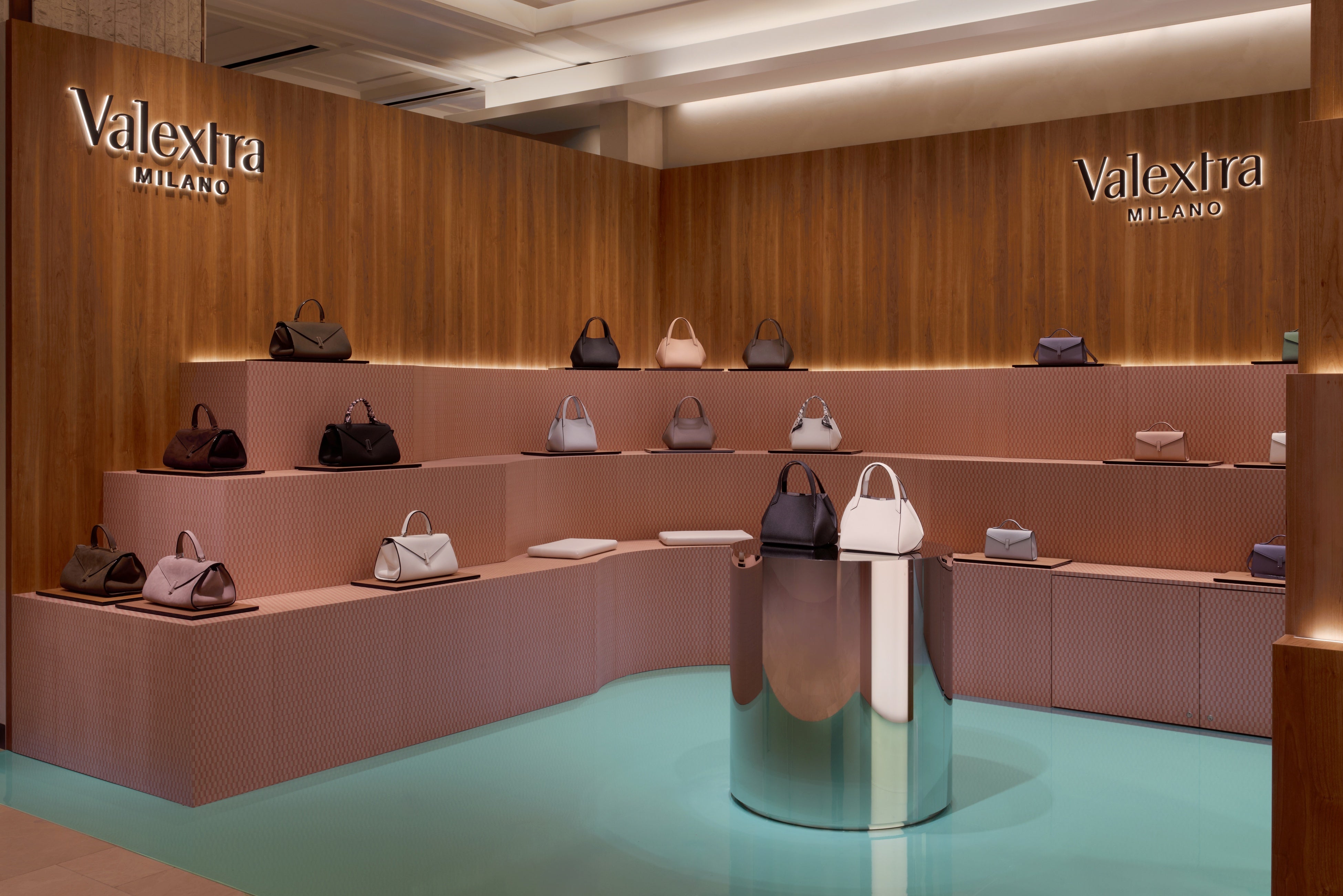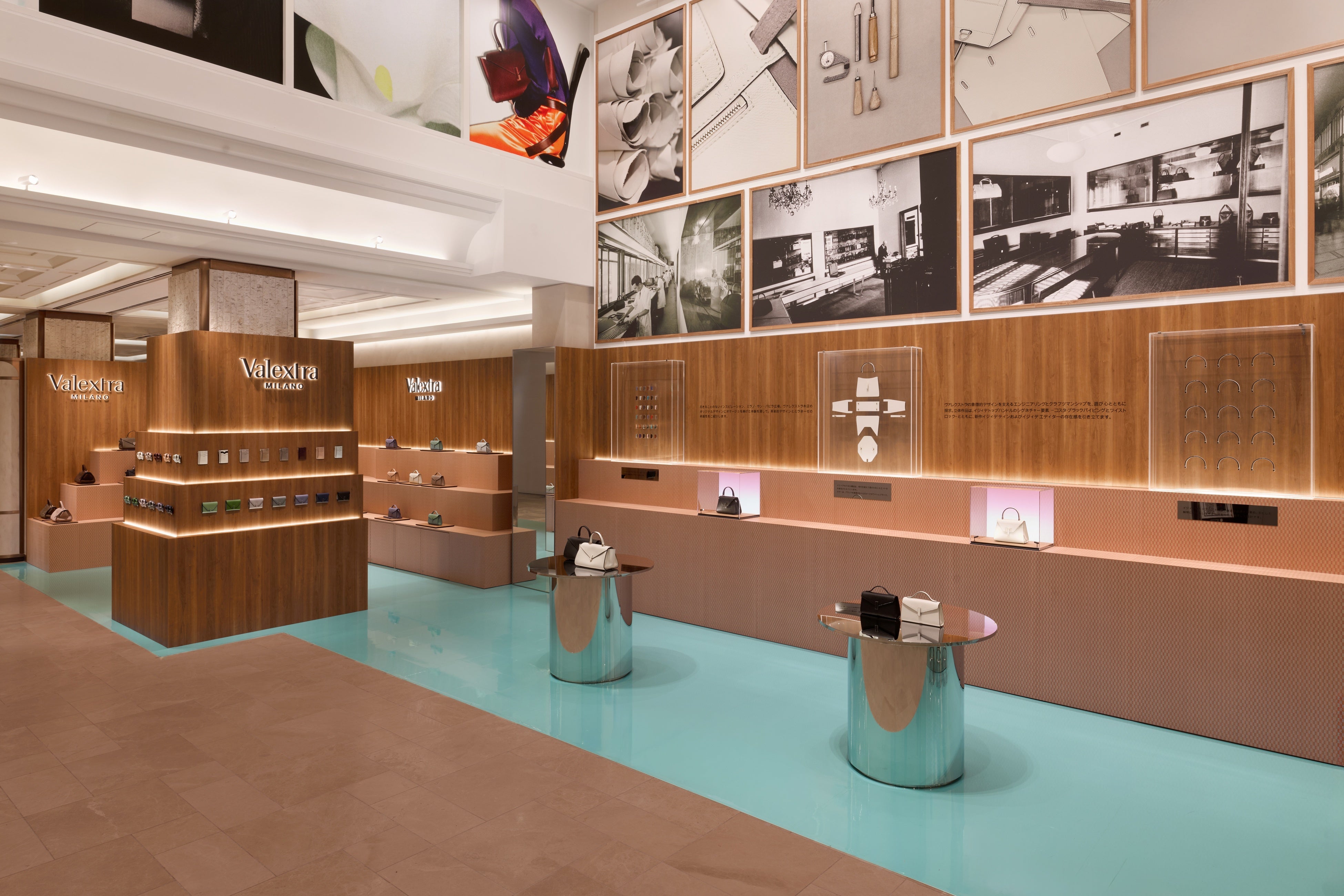 会場デザインは、ヴァレクストラの本拠地ミラノの広場や建築から着想を得た空間です。木製のパネルは、ミラノのサン・バビラ広場にかつて存在した、ブランド最初のブティックをイメージしています。
