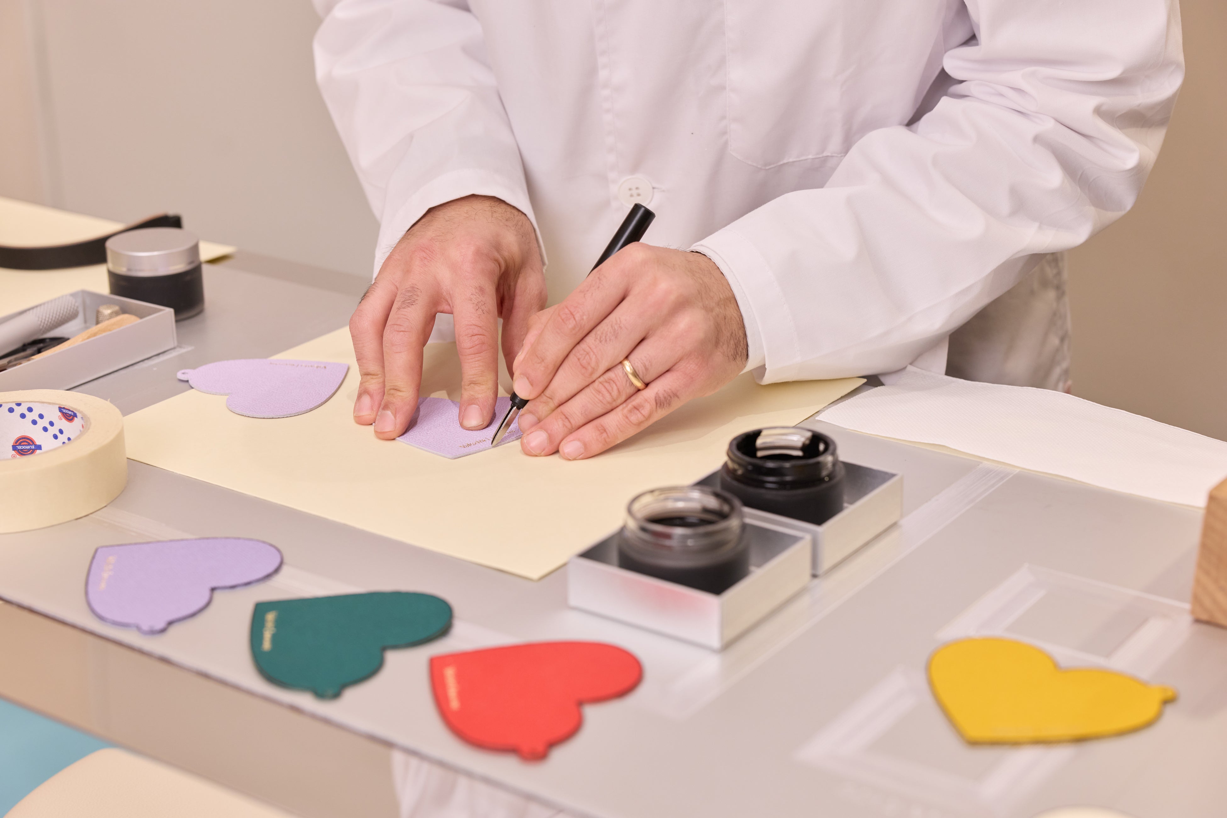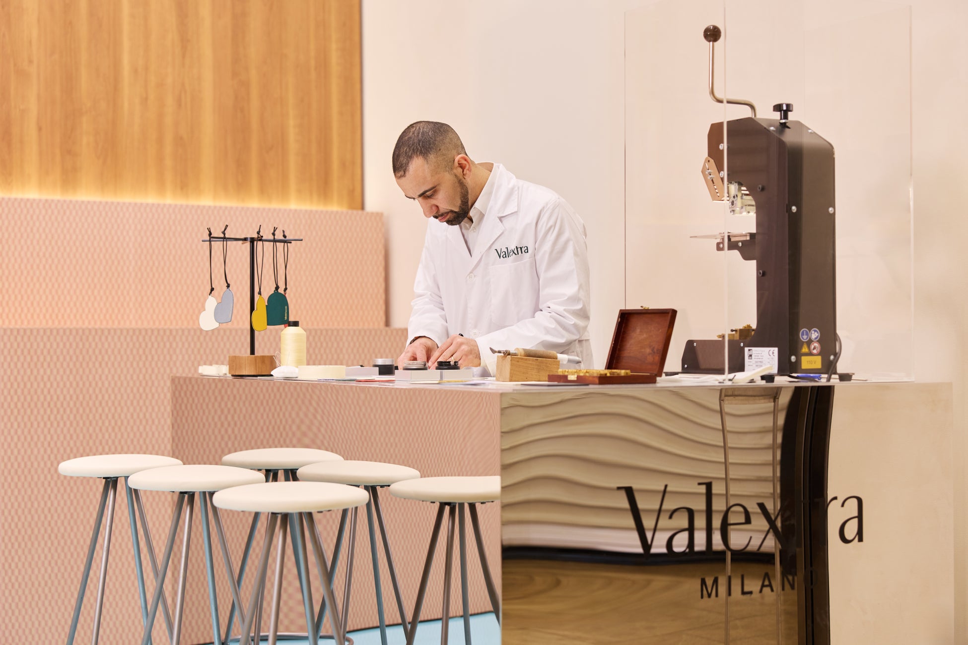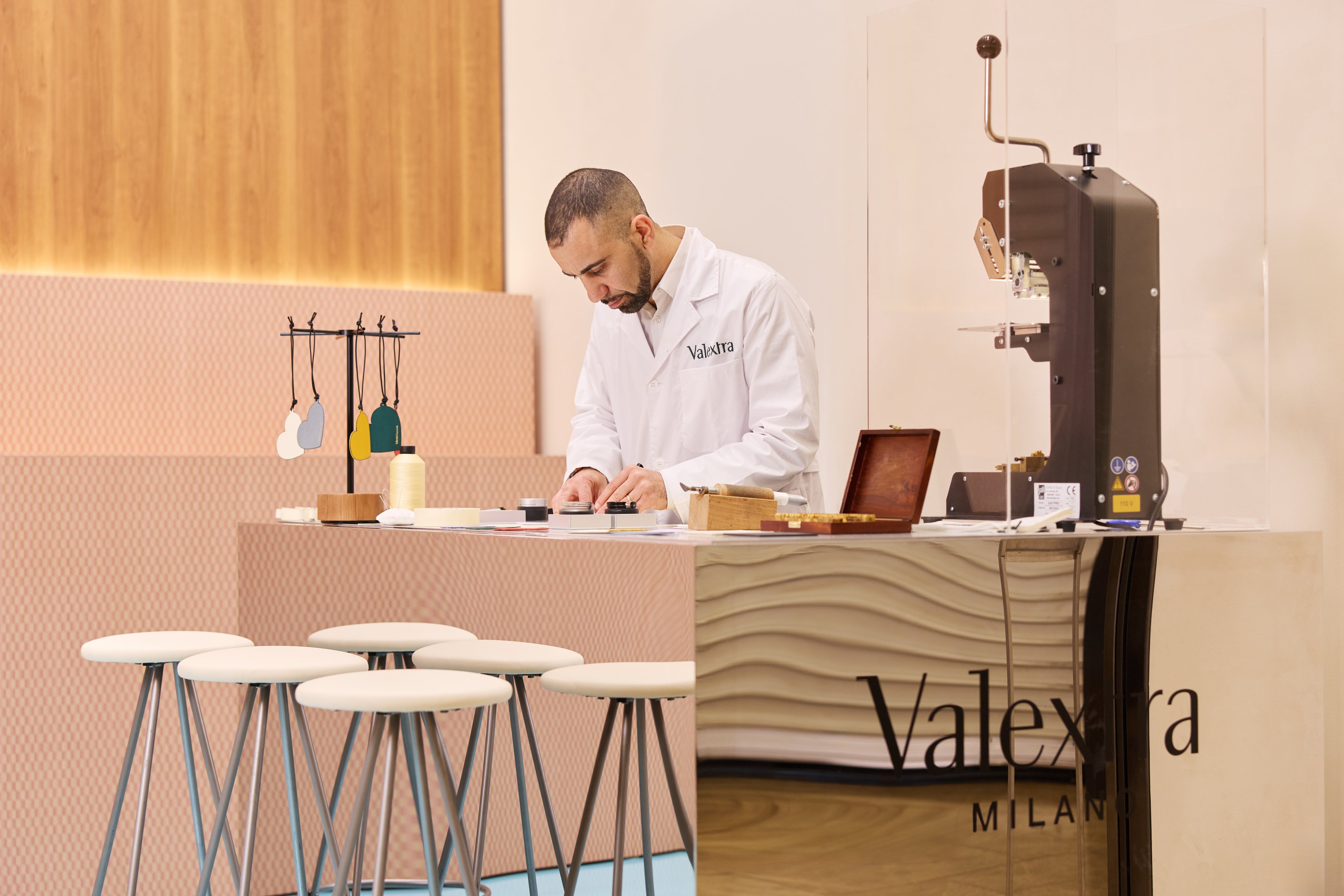 会期中は、ミラノのアトリエから来日した職人による実演も実施。ブランドを象徴する手描きの“インキオストロ ライン”の技法をご体験いただけます。さらに、イニシャル入りチャームのパーソナライズサービスもご用意しています。